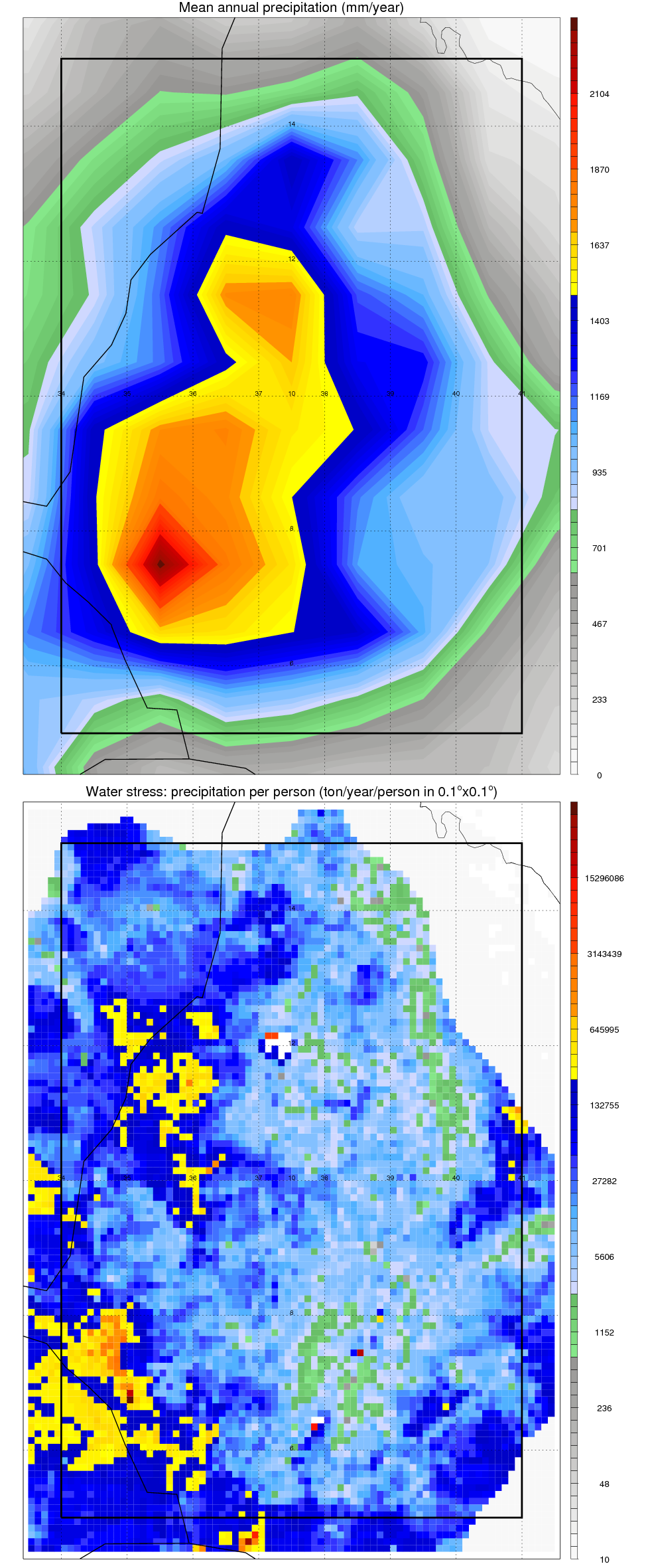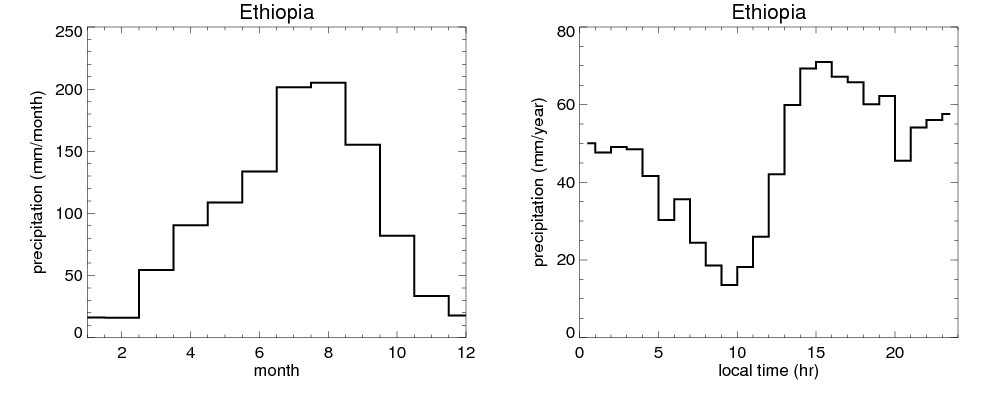 Over Ethiopia , mean annual precipitation are estimated with 1114.4 (mm/year) from precipitation radar, and 1073.9 (mm/year) from microwave radiometer observations. (see high resolution precipitation product , NOTE: it may take long time to generate for large area) In total, thunderstorms (systems with detected lightning flashes) contribute 62 %, MCSs (Mesoscale convective systems with raining area > 2000 km^2) contribute 62 % of all precipitation. Seasonal and diurnal variations of rainfall over Ethiopia are shown in following figure. You may check the details of rainfall contributions from precipitation systems with different sizes and intensities in various seasons and at different local times. |