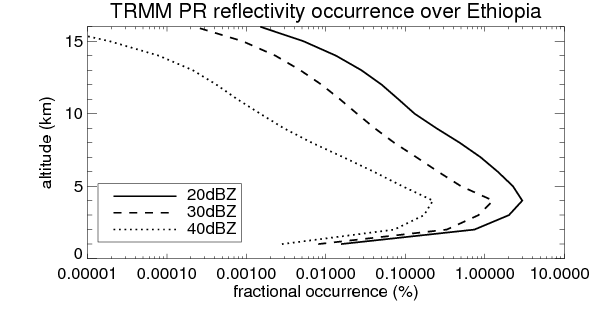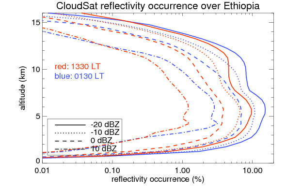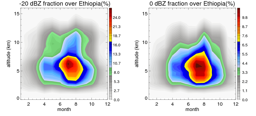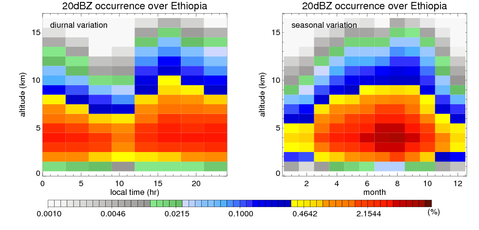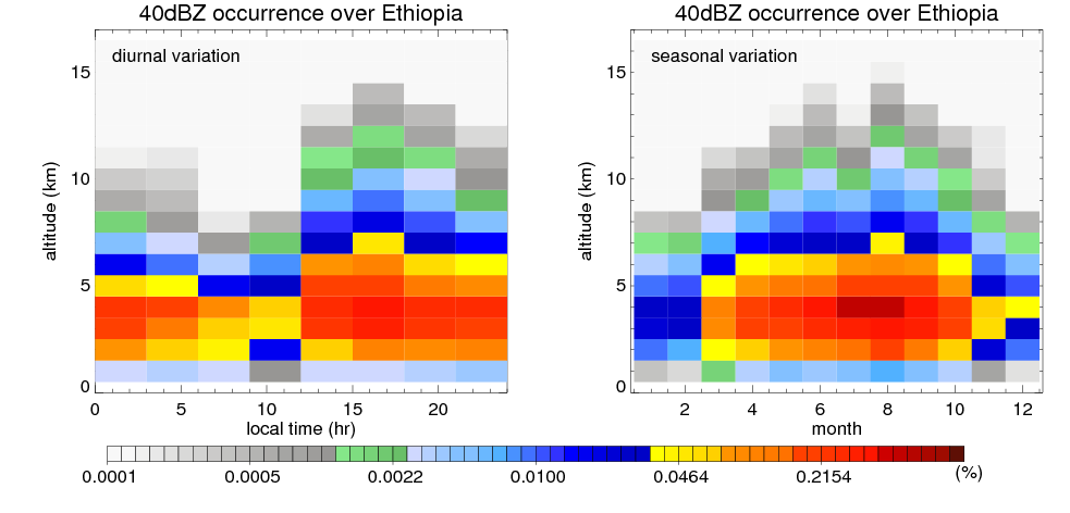 Here the precipitation means the precipitable hydrometeors (raindrops, snow flakes, graupel and hails) that detected by TRMM precipitation radar. Following figure shows the vertical profiles of 20, 30 and 40 dBZ fractional occurrence over Ethiopia in different seasons. The seasonal and diurnal variations of precipitation (20 dBZ) fractional occurrence at different altitudes are shown below: The seasonal and diurnal variations of INTENSIVE precipitation (40 dBZ) fractional occurrence at different altitudes are shown below: Clouds are consisted of small hydrometeors that undetectable by TRMM precipitation radar (Ku band). CloudSat (W band radar) provides the much great details of clouds. Following figure shows the vertical structure of the thin and thick clouds over Ethiopia. Note that high reflectivity at low levels are less frequent due to the attenuation. The seasonal variation of thin (-20 dBZ) and thick (0 dBZ) cloud over Ethiopia are shown below: |