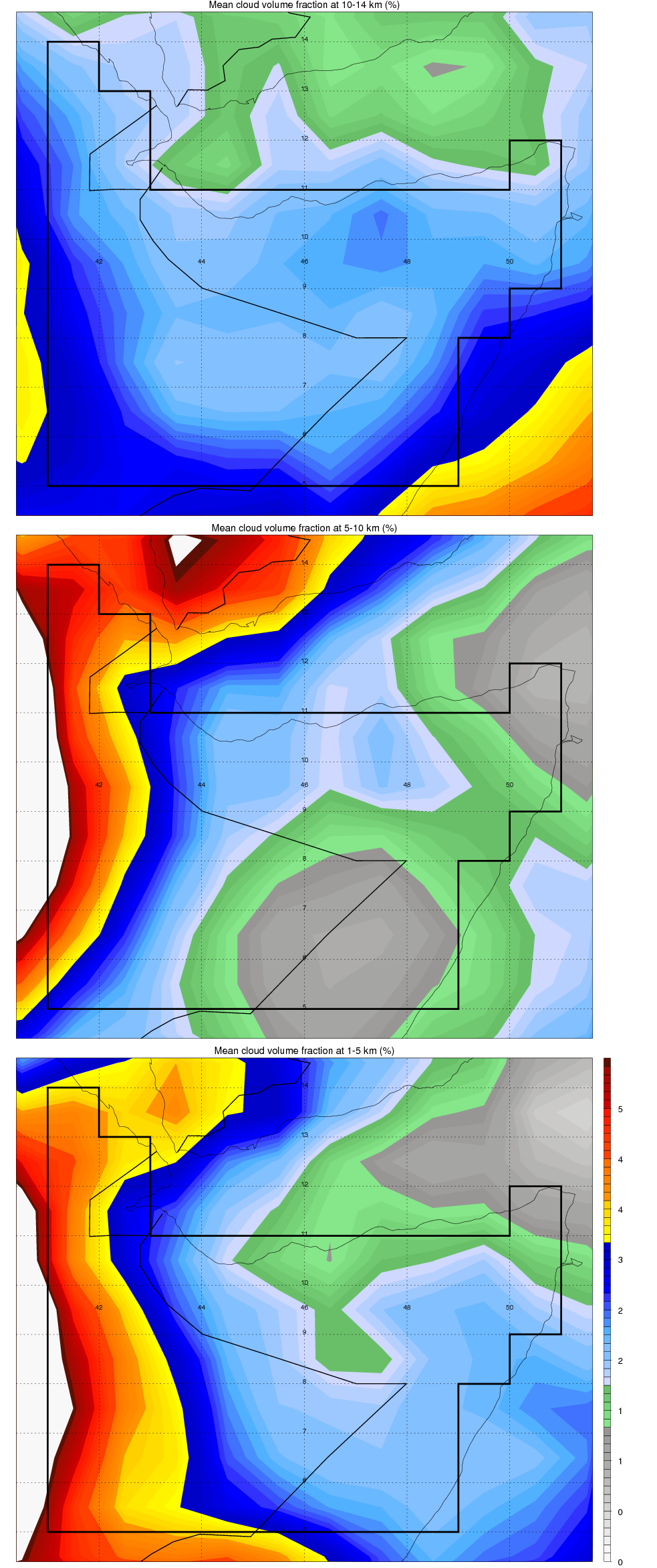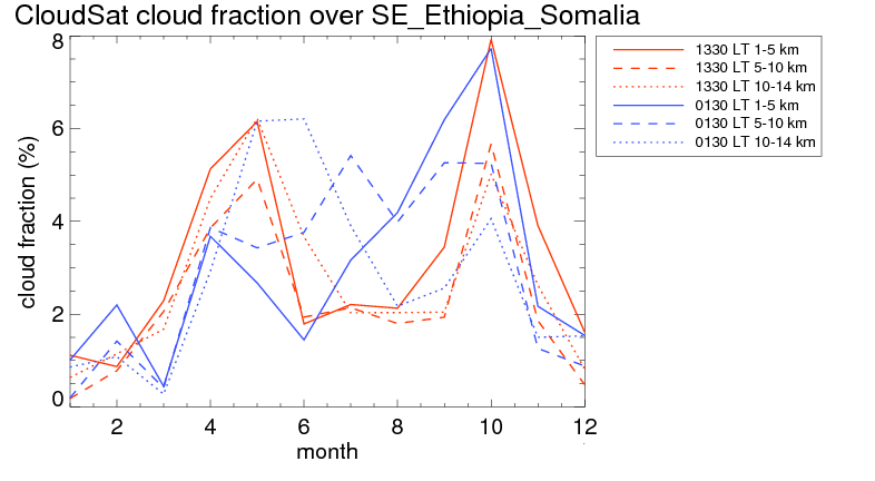 Over SE_Ethiopia_Somalia , mean high level (10-14 km) cloud volume fraction is about 2.7%. Mean mid level (5-10 km) cloud volume fraction is about 2.6%. Mean low level (1-5 km) cloud volume fraction is about 3.2%. Seasonal and day vs. night variations of high, mid and low level cloud fraction over SE_Ethiopia_Somalia are shown in following figure. You may check the details of cloud fraction in various seasons and at different local times. |