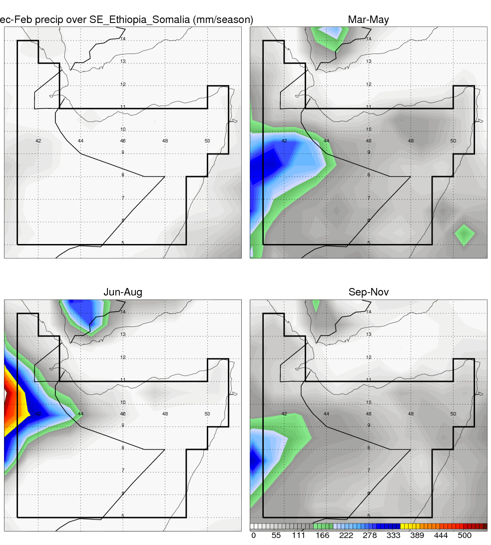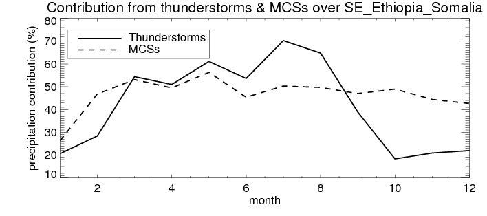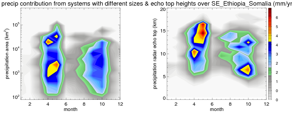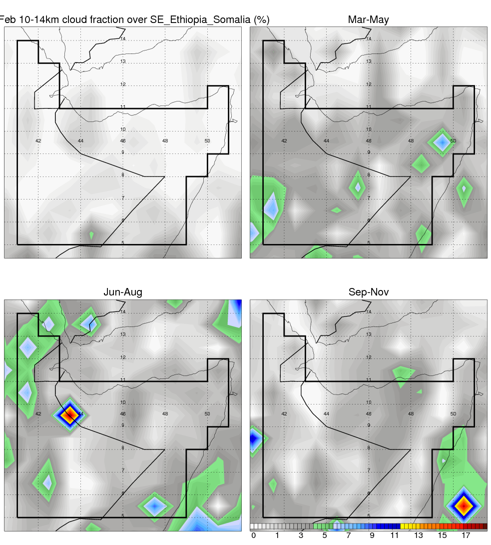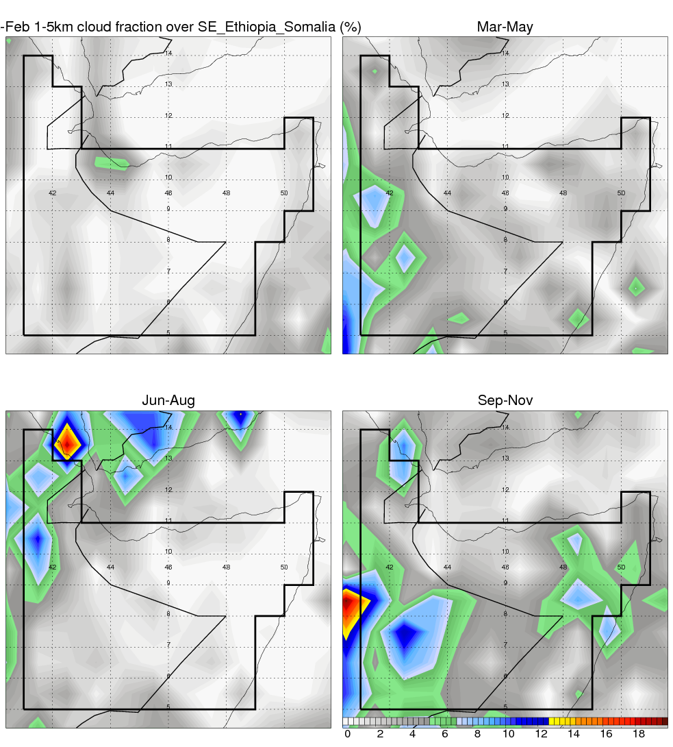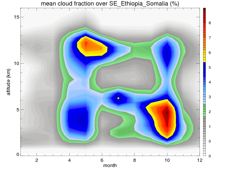 Over SE_Ethiopia_Somalia , mean annual precipitation are estimated with 257.4 (mm/year) from TRMM precipitation radar. (distribution of precipitation see here ) Total surface rainfall is brought by various precipitation systems. The seasonal variation of precipitation from systems with different sizes and heights are shown below: In total, thunderstorms (systems with detected lightning flashes) contribute 45 %, MCSs (Mesoscale convective systems with raining area > 2000 km^2) contribute 49 % of all precipitation. Seasonal variations of fraction of precipitation from thunderstorms and MCSs are shown below: The seasonal variation of geographical distribution of CloudSat cloud fraction over SE_Ethiopia_Somalia is shown below: The seasonal variation of mean CloudSat level cloud fraction at different altitudes over SE_Ethiopia_Somalia is shown below: |