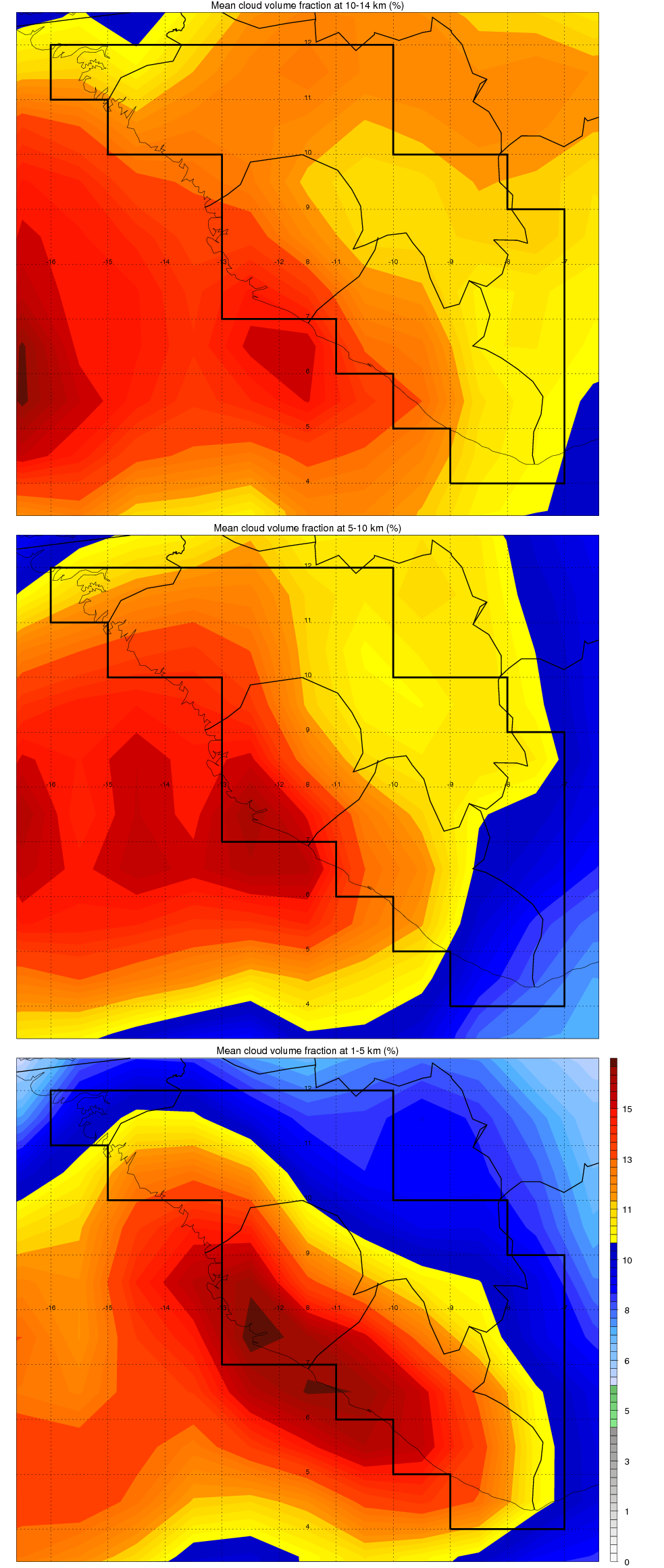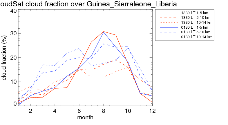 Over Guinea_Sierraleone_Liberia , mean high level (10-14 km) cloud volume fraction is about 12.8%. Mean mid level (5-10 km) cloud volume fraction is about 12.8%. Mean low level (1-5 km) cloud volume fraction is about 13.2%. Seasonal and day vs. night variations of high, mid and low level cloud fraction over Guinea_Sierraleone_Liberia are shown in following figure. You may check the details of cloud fraction in various seasons and at different local times. |