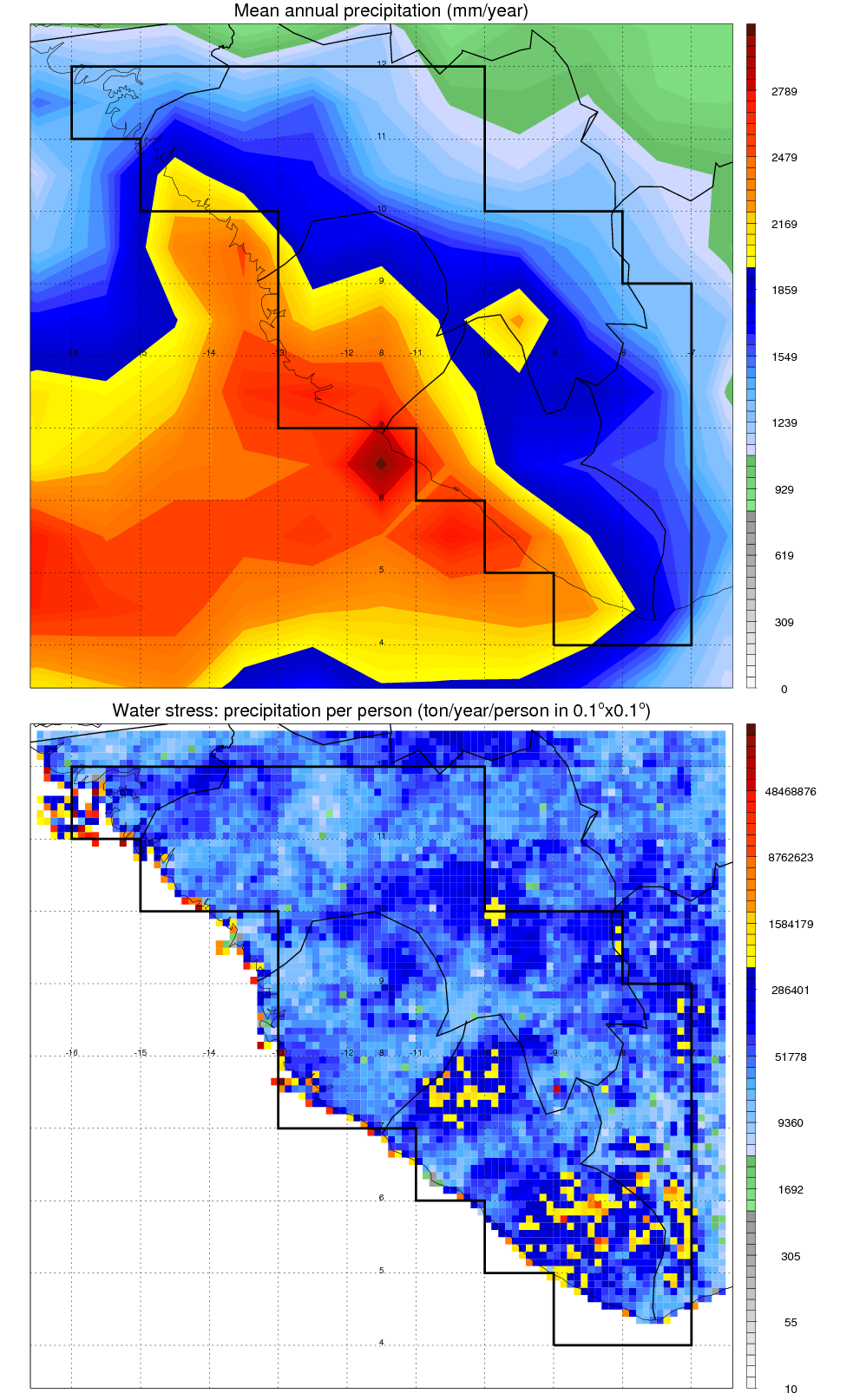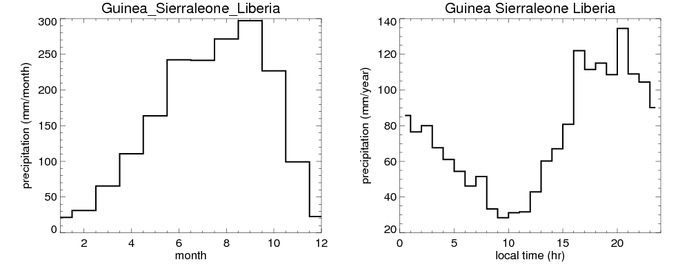 Over Guinea_Sierraleone_Liberia , mean annual precipitation are estimated with 1794.4 (mm/year) from precipitation radar, and 1790.3 (mm/year) from microwave radiometer observations. (see high resolution precipitation product , NOTE: it may take long time to generate for large area) In total, thunderstorms (systems with detected lightning flashes) contribute 61 %, MCSs (Mesoscale convective systems with raining area > 2000 km^2) contribute 74 % of all precipitation. Seasonal and diurnal variations of rainfall over Guinea_Sierraleone_Liberia are shown in following figure. You may check the details of rainfall contributions from precipitation systems with different sizes and intensities in various seasons and at different local times. |