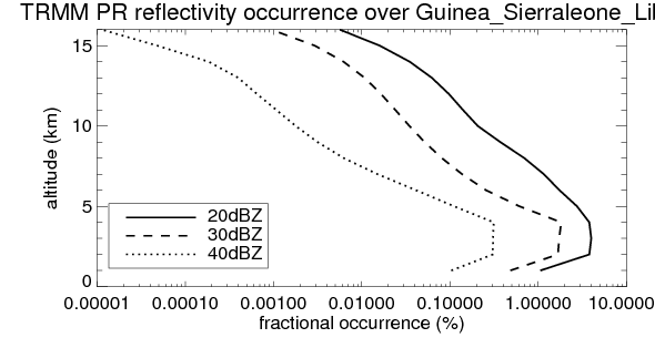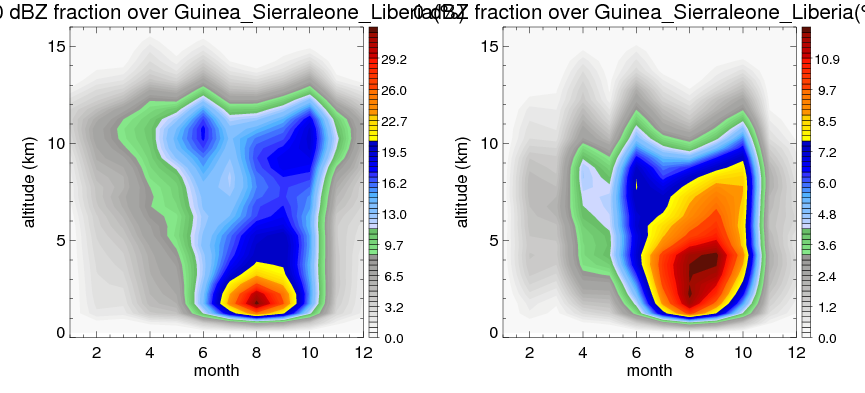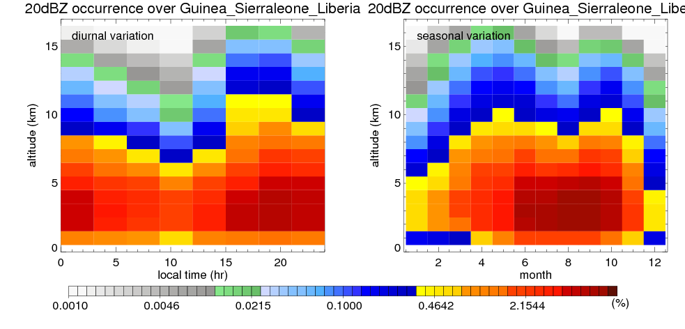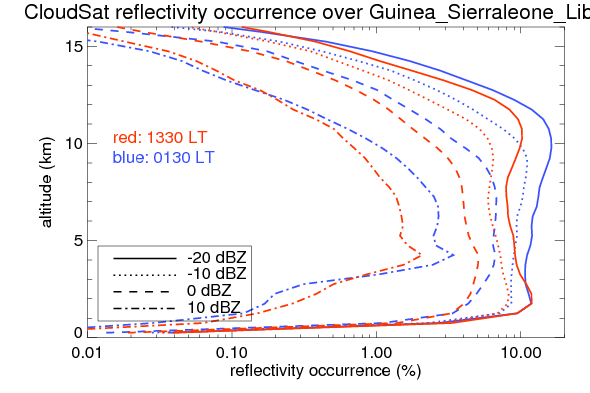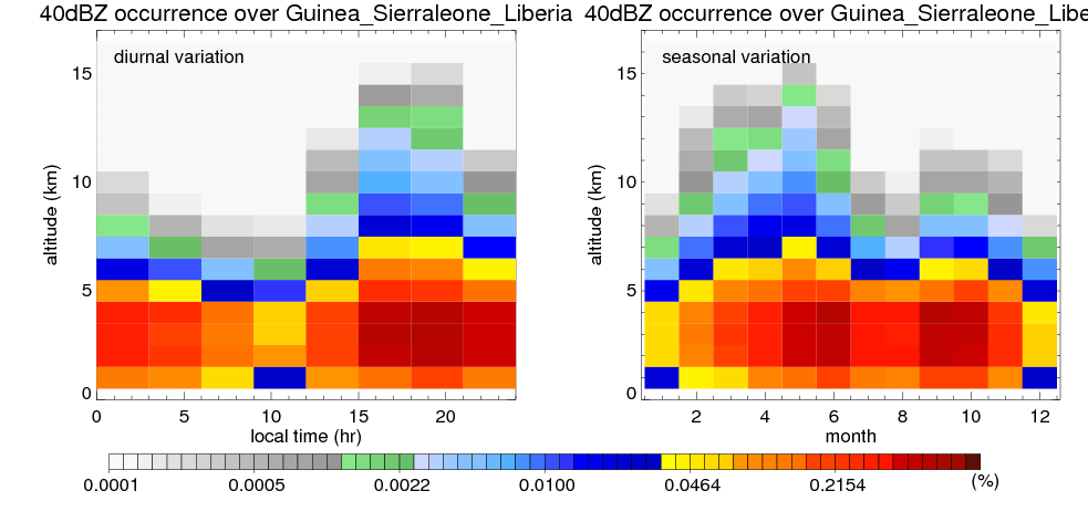 Here the precipitation means the precipitable hydrometeors (raindrops, snow flakes, graupel and hails) that detected by TRMM precipitation radar. Following figure shows the vertical profiles of 20, 30 and 40 dBZ fractional occurrence over Guinea_Sierraleone_Liberia in different seasons. The seasonal and diurnal variations of precipitation (20 dBZ) fractional occurrence at different altitudes are shown below: The seasonal and diurnal variations of INTENSIVE precipitation (40 dBZ) fractional occurrence at different altitudes are shown below: Clouds are consisted of small hydrometeors that undetectable by TRMM precipitation radar (Ku band). CloudSat (W band radar) provides the much great details of clouds. Following figure shows the vertical structure of the thin and thick clouds over Guinea_Sierraleone_Liberia. Note that high reflectivity at low levels are less frequent due to the attenuation. The seasonal variation of thin (-20 dBZ) and thick (0 dBZ) cloud over Guinea_Sierraleone_Liberia are shown below: |