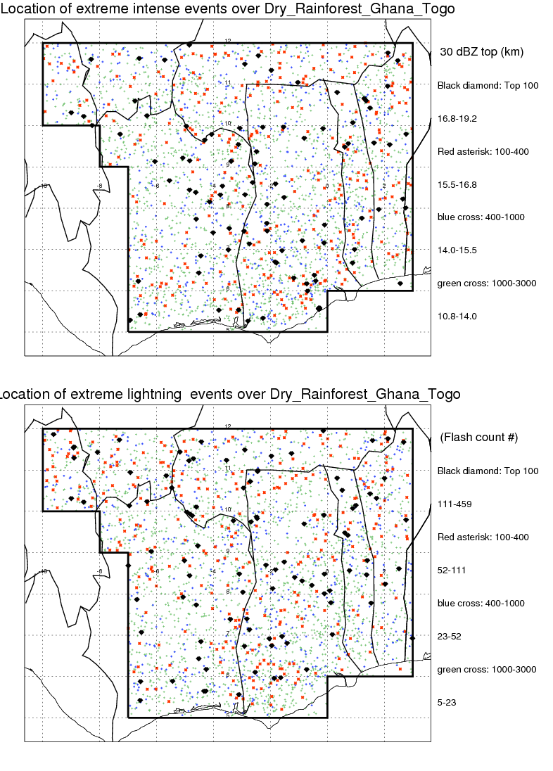 Following figure shows the location of the precipitation feautres categorized by the lightning rate and 30 dBZ echo top.