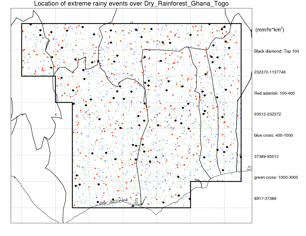 Following figure shows the location of the precipitation feautres categorized by the volumetric rainfall.