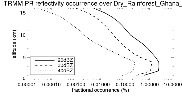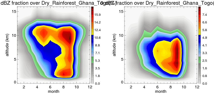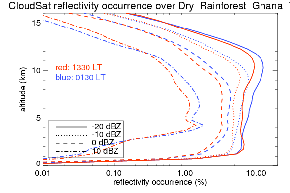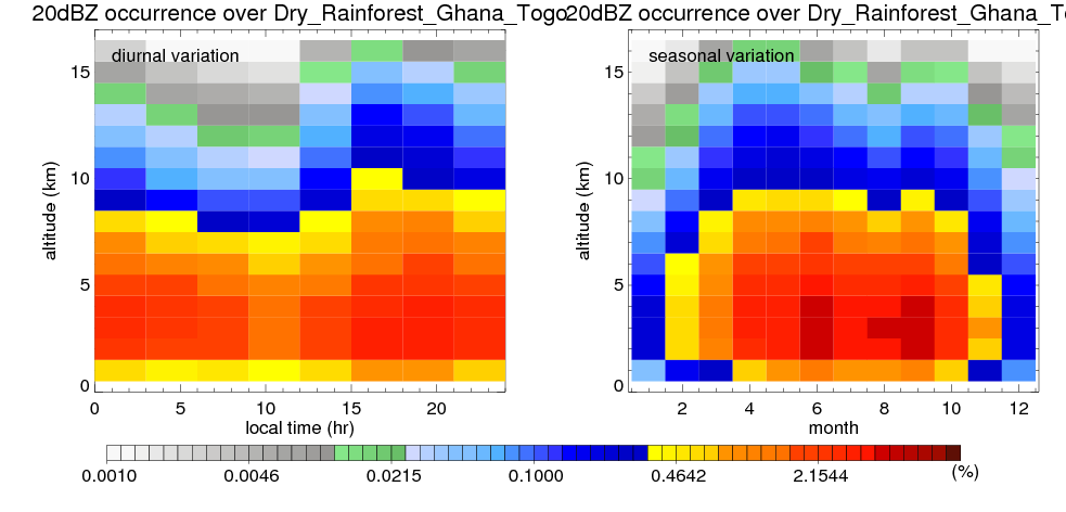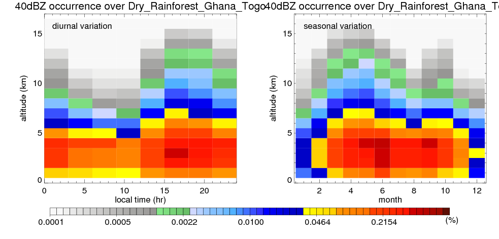 Here the precipitation means the precipitable hydrometeors (raindrops, snow flakes, graupel and hails) that detected by TRMM precipitation radar. Following figure shows the vertical profiles of 20, 30 and 40 dBZ fractional occurrence over Dry_Rainforest_Ghana_Togo in different seasons. The seasonal and diurnal variations of precipitation (20 dBZ) fractional occurrence at different altitudes are shown below: The seasonal and diurnal variations of INTENSIVE precipitation (40 dBZ) fractional occurrence at different altitudes are shown below: Clouds are consisted of small hydrometeors that undetectable by TRMM precipitation radar (Ku band). CloudSat (W band radar) provides the much great details of clouds. Following figure shows the vertical structure of the thin and thick clouds over Dry_Rainforest_Ghana_Togo. Note that high reflectivity at low levels are less frequent due to the attenuation. The seasonal variation of thin (-20 dBZ) and thick (0 dBZ) cloud over Dry_Rainforest_Ghana_Togo are shown below: |