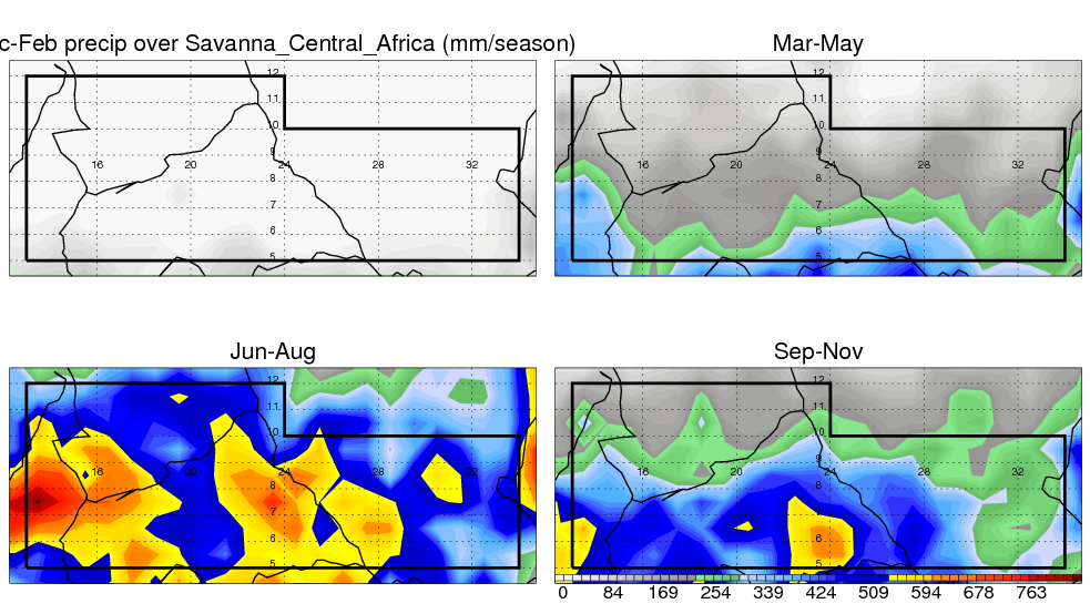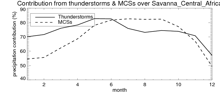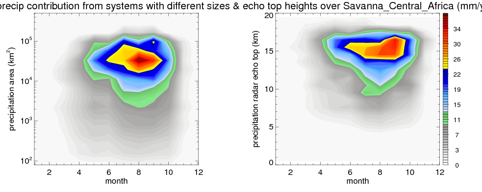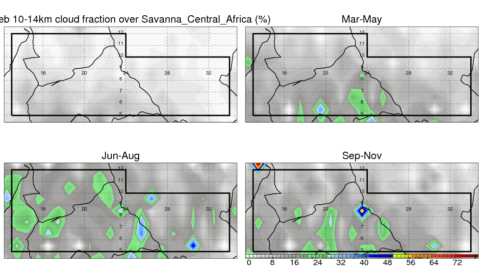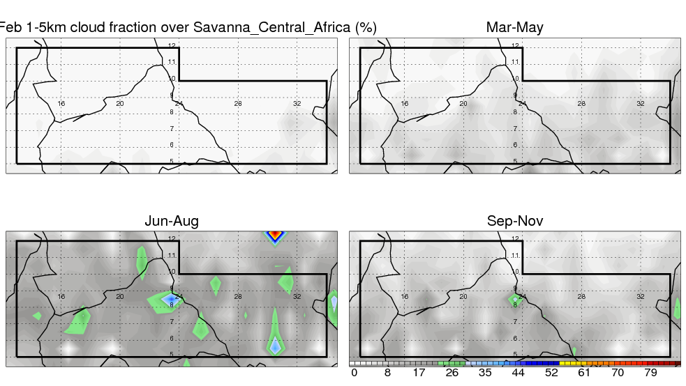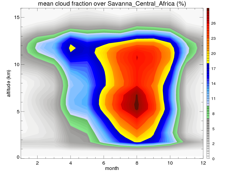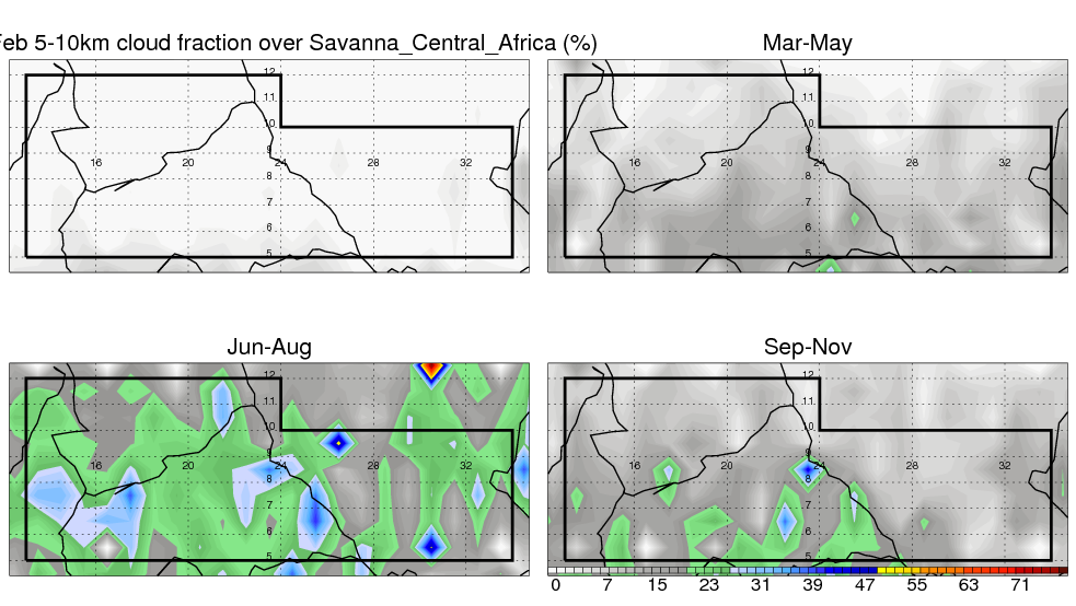 Over Savanna_Central_Africa , mean annual precipitation are estimated with 1052.3 (mm/year) from TRMM precipitation radar. (distribution of precipitation see here ) Total surface rainfall is brought by various precipitation systems. The seasonal variation of precipitation from systems with different sizes and heights are shown below: In total, thunderstorms (systems with detected lightning flashes) contribute 76 %, MCSs (Mesoscale convective systems with raining area > 2000 km^2) contribute 79 % of all precipitation. Seasonal variations of fraction of precipitation from thunderstorms and MCSs are shown below: The seasonal variation of geographical distribution of CloudSat cloud fraction over Savanna_Central_Africa is shown below: The seasonal variation of mean CloudSat level cloud fraction at different altitudes over Savanna_Central_Africa is shown below: |