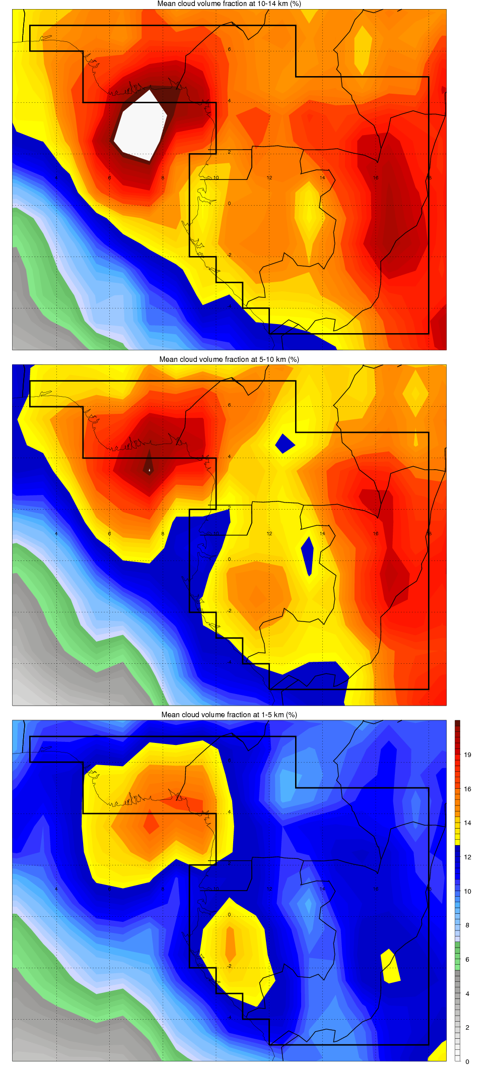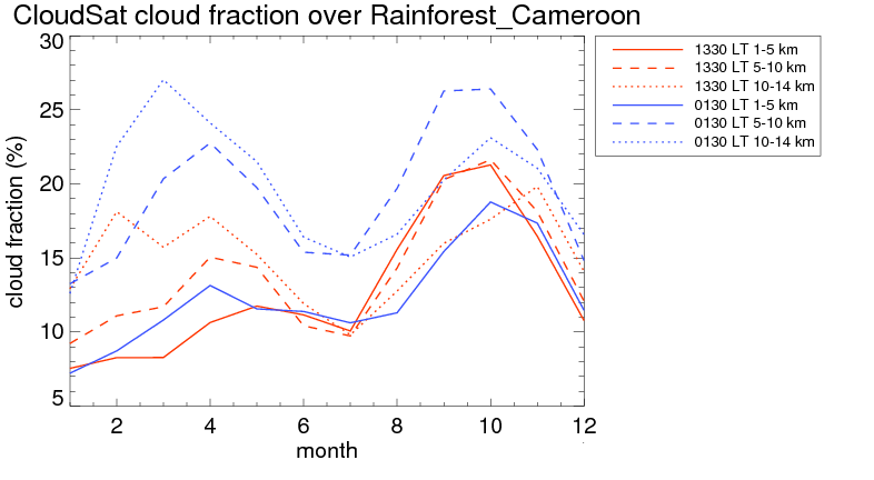 Over Rainforest_Cameroon , mean high level (10-14 km) cloud volume fraction is about 17.0%. Mean mid level (5-10 km) cloud volume fraction is about 16.3%. Mean low level (1-5 km) cloud volume fraction is about 12.8%. Seasonal and day vs. night variations of high, mid and low level cloud fraction over Rainforest_Cameroon are shown in following figure. You may check the details of cloud fraction in various seasons and at different local times. |