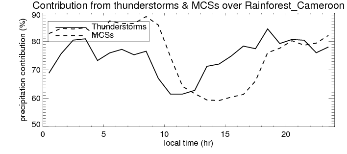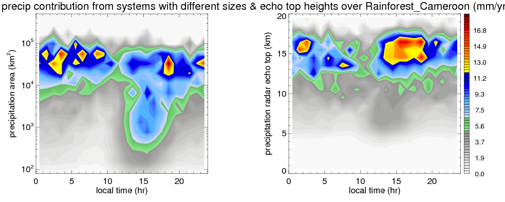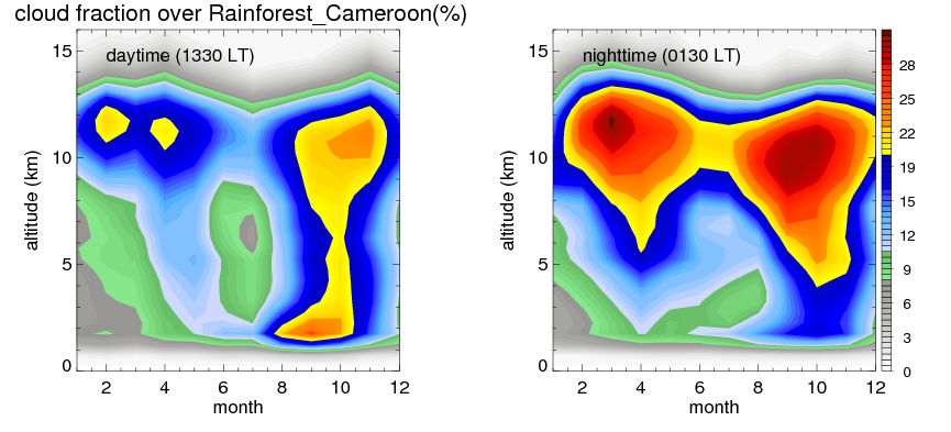 Many studies suggested that the diurnal variation of the precipitation is related to the life cycles of the precipitation systems, which is frequently driven by the surface sensible heating. Over Rainforest_Cameroon, mean annual precipitation are estimated with 1739.6 (mm/year) from precipitation radar. Detailed diurnal variation of the precipitation at high resolution can be accessed here (NOTE: it may take long time to generate for a large area). The diurnal variation of precipitation from systems with different sizes and heights are shown below: In total, thunderstorms (systems with detected lightning flashes) contribute 75 %, MCSs (Mesoscale convective systems with raining area > 2000 km^2) contribute 75 % of all precipitation over Rainforest_Cameroon. Diurnal variations of fraction of precipitation from thunderstorms and MCSs over Rainforest_Cameroon are shown below: Certainly there is a strong diurnal variation of different types of clouds. Because CloudSat observes at 0130 and 1330 local time, here the daytime and night cloud fraction in different seasons are presented: |