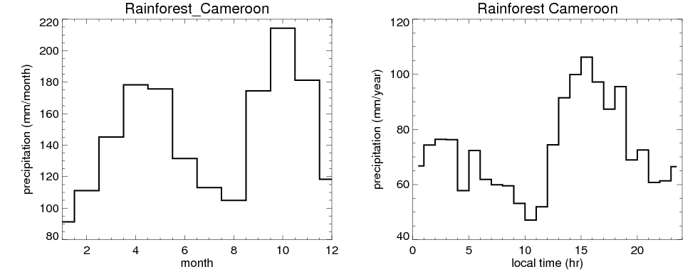 Over Rainforest_Cameroon , mean annual precipitation are estimated with 1739.6 (mm/year) from precipitation radar, and 1930.5 (mm/year) from microwave radiometer observations. (see high resolution precipitation product , NOTE: it may take long time to generate for large area) In total, thunderstorms (systems with detected lightning flashes) contribute 75 %, MCSs (Mesoscale convective systems with raining area > 2000 km^2) contribute 75 % of all precipitation. Seasonal and diurnal variations of rainfall over Rainforest_Cameroon are shown in following figure. You may check the details of rainfall contributions from precipitation systems with different sizes and intensities in various seasons and at different local times. |