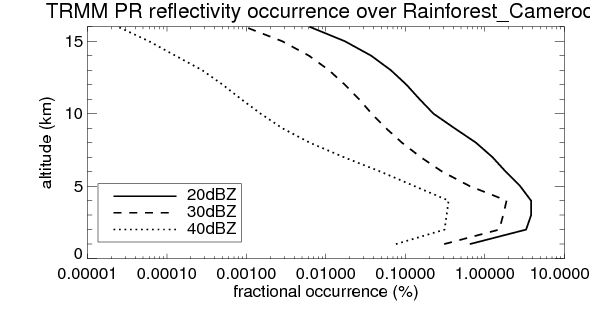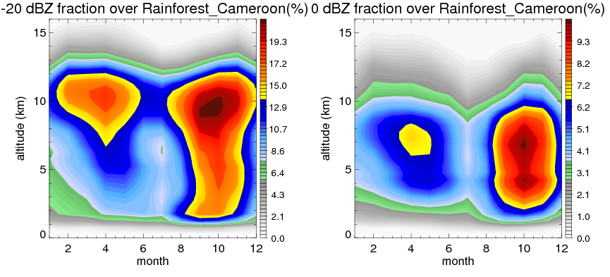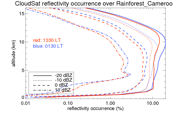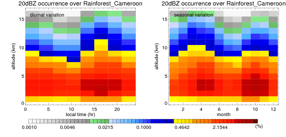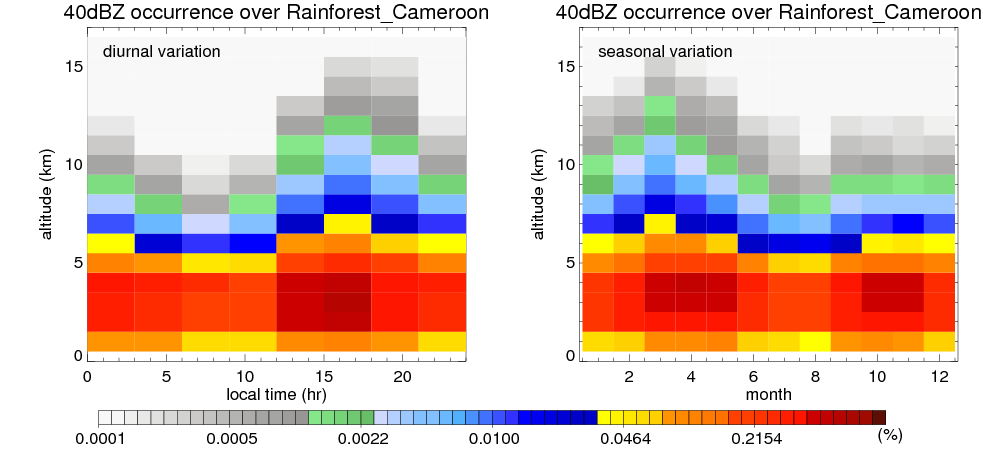 Here the precipitation means the precipitable hydrometeors (raindrops, snow flakes, graupel and hails) that detected by TRMM precipitation radar. Following figure shows the vertical profiles of 20, 30 and 40 dBZ fractional occurrence over Rainforest_Cameroon in different seasons. The seasonal and diurnal variations of precipitation (20 dBZ) fractional occurrence at different altitudes are shown below: The seasonal and diurnal variations of INTENSIVE precipitation (40 dBZ) fractional occurrence at different altitudes are shown below: Clouds are consisted of small hydrometeors that undetectable by TRMM precipitation radar (Ku band). CloudSat (W band radar) provides the much great details of clouds. Following figure shows the vertical structure of the thin and thick clouds over Rainforest_Cameroon. Note that high reflectivity at low levels are less frequent due to the attenuation. The seasonal variation of thin (-20 dBZ) and thick (0 dBZ) cloud over Rainforest_Cameroon are shown below: |