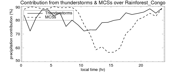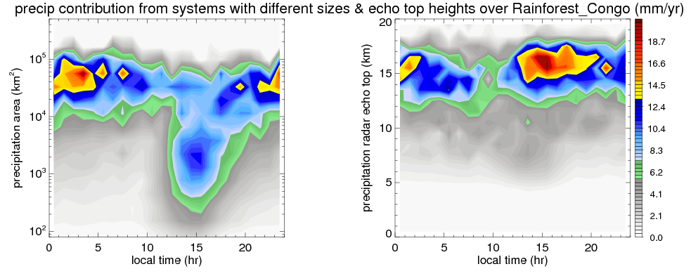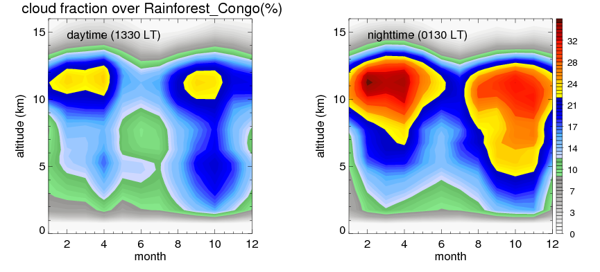 Many studies suggested that the diurnal variation of the precipitation is related to the life cycles of the precipitation systems, which is frequently driven by the surface sensible heating. Over Rainforest_Congo, mean annual precipitation are estimated with 1859.6 (mm/year) from precipitation radar. Detailed diurnal variation of the precipitation at high resolution can be accessed here (NOTE: it may take long time to generate for a large area). The diurnal variation of precipitation from systems with different sizes and heights are shown below: In total, thunderstorms (systems with detected lightning flashes) contribute 81 %, MCSs (Mesoscale convective systems with raining area > 2000 km^2) contribute 77 % of all precipitation over Rainforest_Congo. Diurnal variations of fraction of precipitation from thunderstorms and MCSs over Rainforest_Congo are shown below: Certainly there is a strong diurnal variation of different types of clouds. Because CloudSat observes at 0130 and 1330 local time, here the daytime and night cloud fraction in different seasons are presented: |