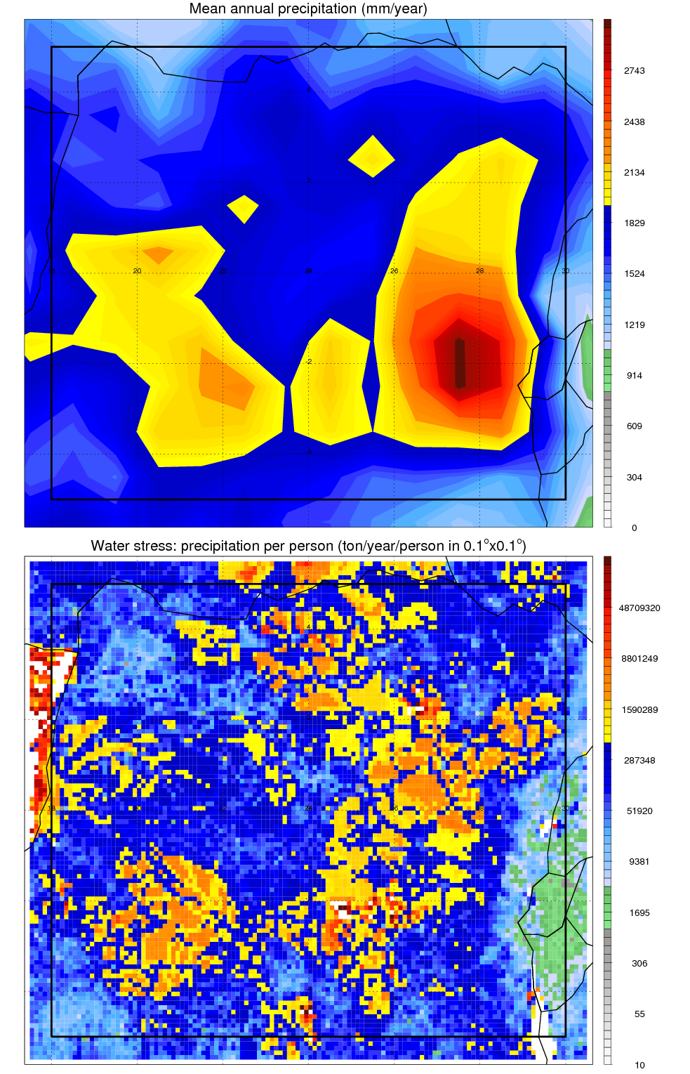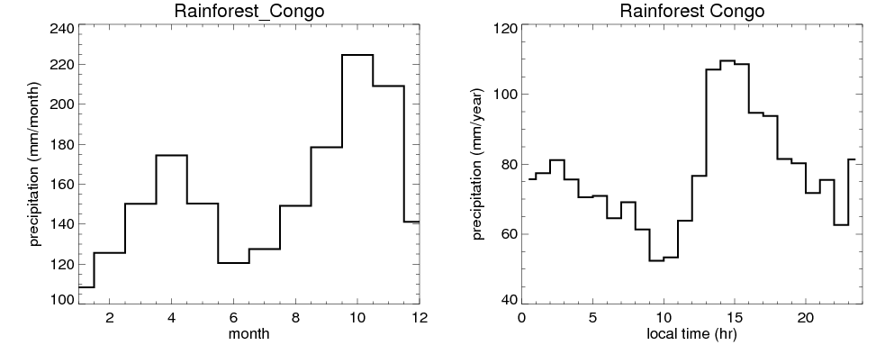 Over Rainforest_Congo , mean annual precipitation are estimated with 1859.6 (mm/year) from precipitation radar, and 2400.8 (mm/year) from microwave radiometer observations. (see high resolution precipitation product , NOTE: it may take long time to generate for large area) In total, thunderstorms (systems with detected lightning flashes) contribute 81 %, MCSs (Mesoscale convective systems with raining area > 2000 km^2) contribute 77 % of all precipitation. Seasonal and diurnal variations of rainfall over Rainforest_Congo are shown in following figure. You may check the details of rainfall contributions from precipitation systems with different sizes and intensities in various seasons and at different local times. |