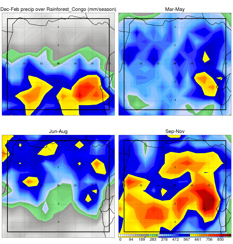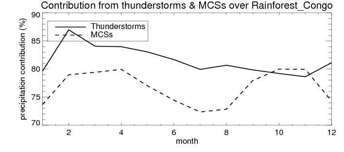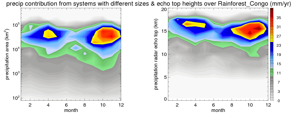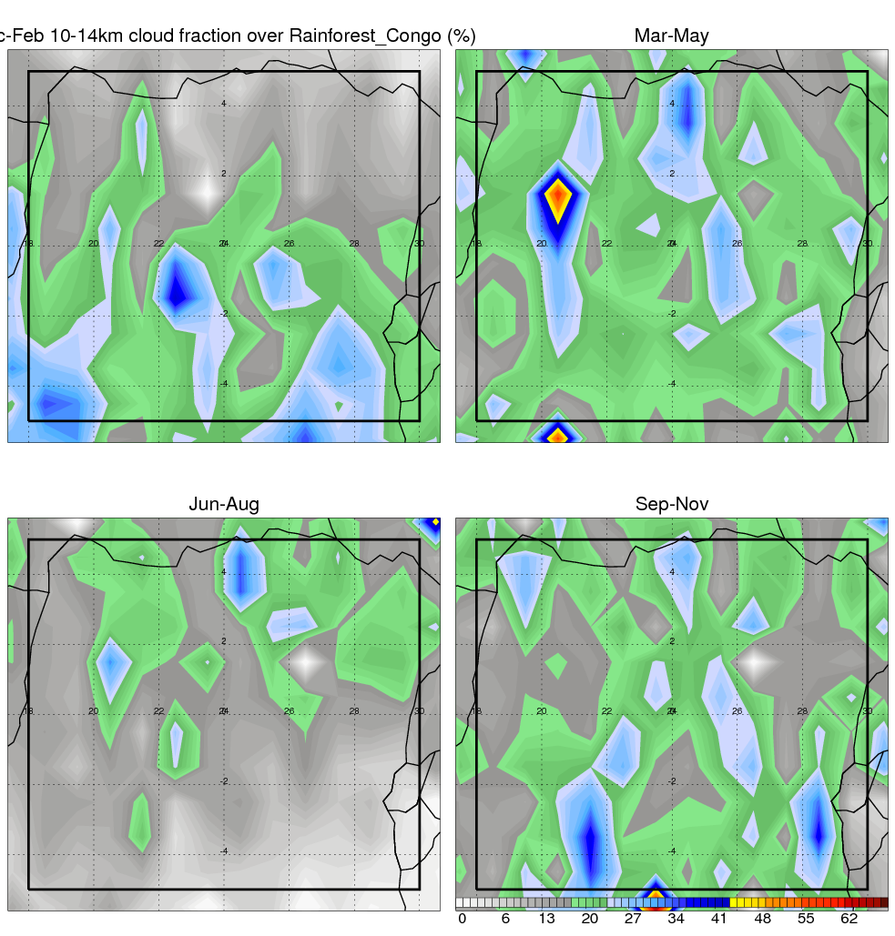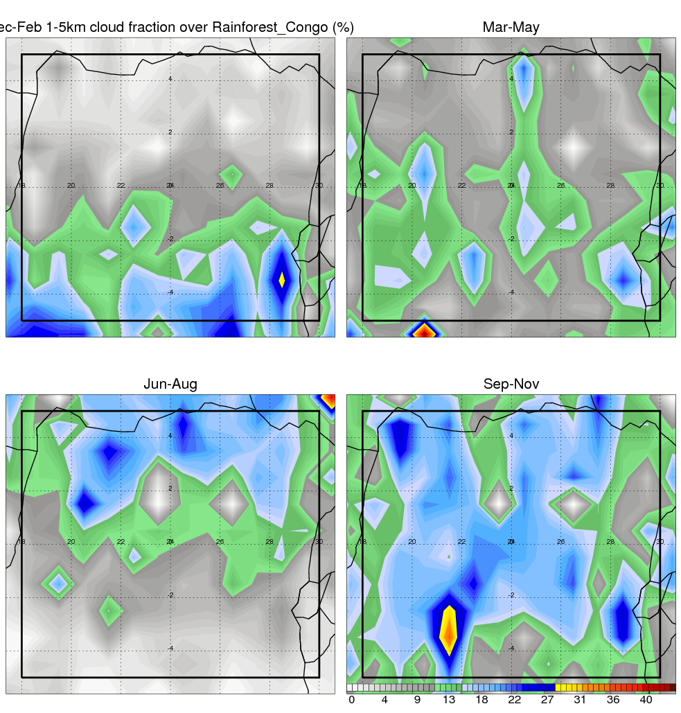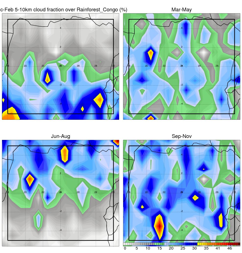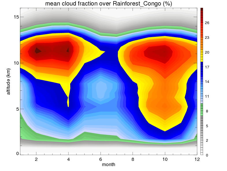 Over Rainforest_Congo , mean annual precipitation are estimated with 1859.6 (mm/year) from TRMM precipitation radar. (distribution of precipitation see here ) Total surface rainfall is brought by various precipitation systems. The seasonal variation of precipitation from systems with different sizes and heights are shown below: In total, thunderstorms (systems with detected lightning flashes) contribute 81 %, MCSs (Mesoscale convective systems with raining area > 2000 km^2) contribute 77 % of all precipitation. Seasonal variations of fraction of precipitation from thunderstorms and MCSs are shown below: The seasonal variation of geographical distribution of CloudSat cloud fraction over Rainforest_Congo is shown below: The seasonal variation of mean CloudSat level cloud fraction at different altitudes over Rainforest_Congo is shown below: |