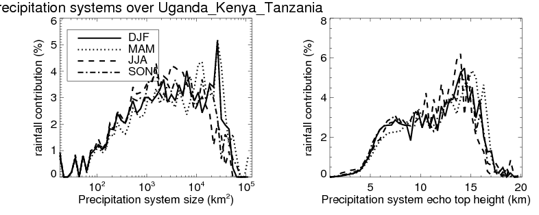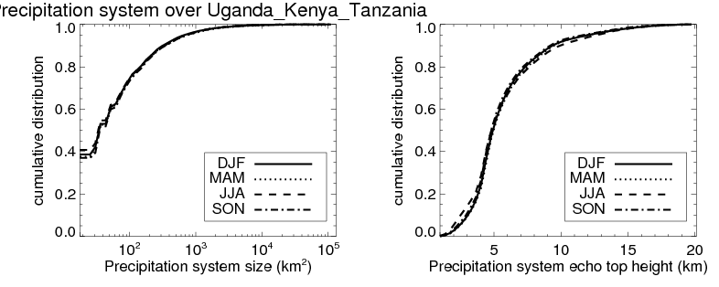 Over Uganda_Kenya_Tanzania , mean size of precipitation system about 274.9 (km^2) and mean maximum radar echo top height of these precipitation systems is about 6.1 km. Following figure shows the cumulative distribution of the sizes and depths of the precipitation systems in different seasons: Though usually there are more small systems, the larger systems would bring more total precipitation. |