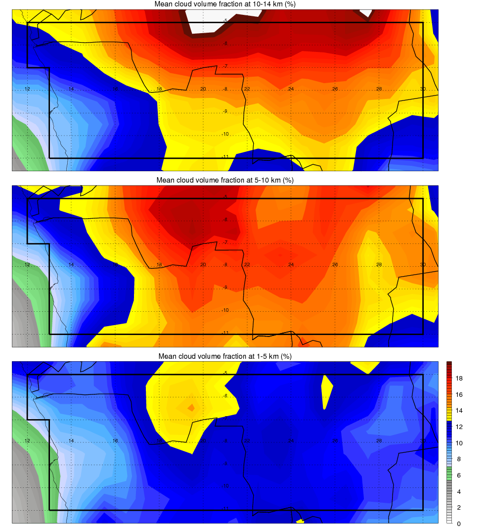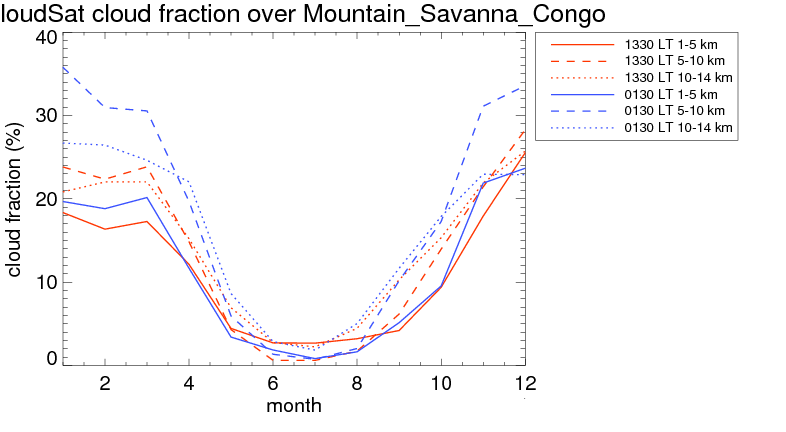 Over Mountain_Savanna_Congo , mean high level (10-14 km) cloud volume fraction is about 14.6%. Mean mid level (5-10 km) cloud volume fraction is about 14.9%. Mean low level (1-5 km) cloud volume fraction is about 11.0%. Seasonal and day vs. night variations of high, mid and low level cloud fraction over Mountain_Savanna_Congo are shown in following figure. You may check the details of cloud fraction in various seasons and at different local times. |