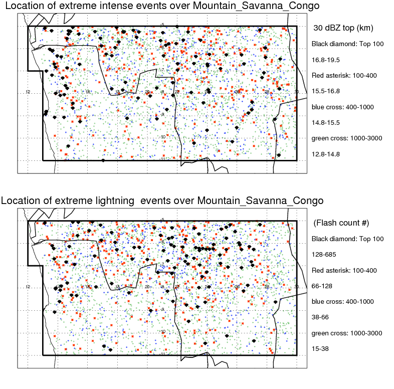 Following figure shows the location of the precipitation feautres categorized by the lightning rate and 30 dBZ echo top.