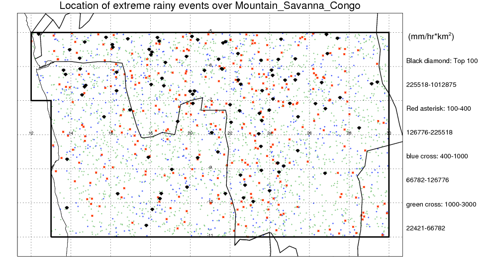 Following figure shows the location of the precipitation feautres categorized by the volumetric rainfall.