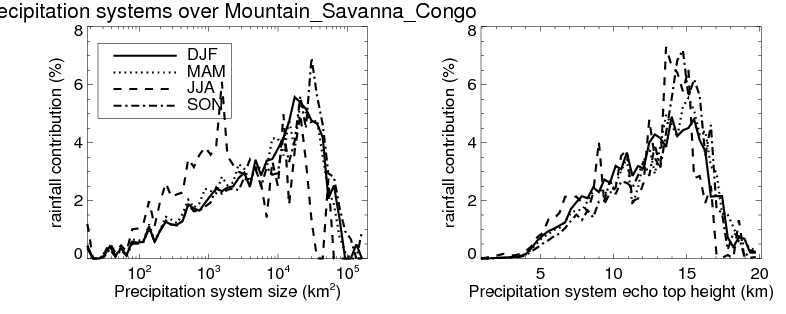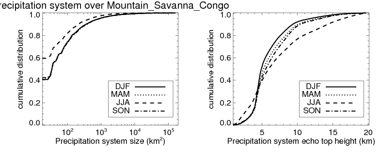 Over Mountain_Savanna_Congo , mean size of precipitation system about 385.3 (km^2) and mean maximum radar echo top height of these precipitation systems is about 6.6 km. Following figure shows the cumulative distribution of the sizes and depths of the precipitation systems in different seasons: Though usually there are more small systems, the larger systems would bring more total precipitation. |