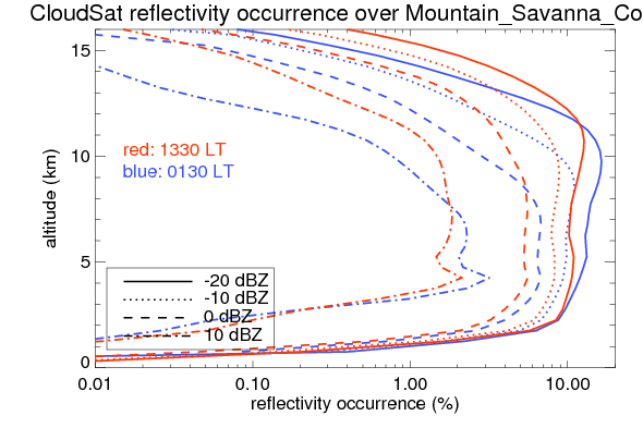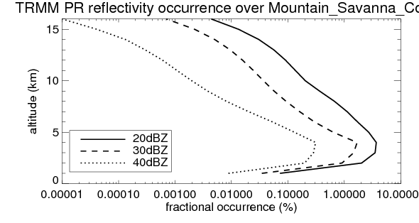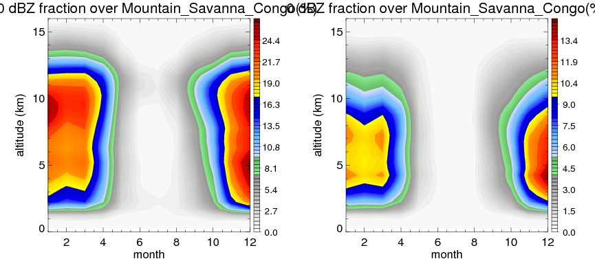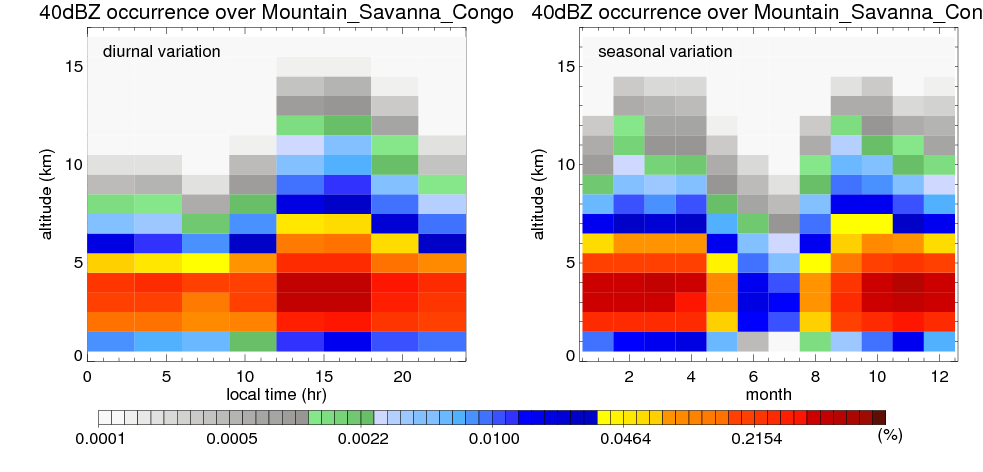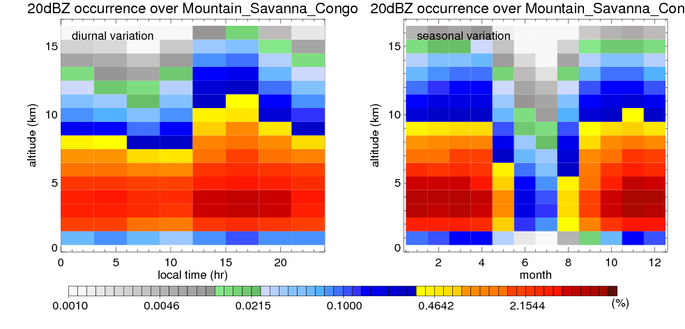 Here the precipitation means the precipitable hydrometeors (raindrops, snow flakes, graupel and hails) that detected by TRMM precipitation radar. Following figure shows the vertical profiles of 20, 30 and 40 dBZ fractional occurrence over Mountain_Savanna_Congo in different seasons. The seasonal and diurnal variations of precipitation (20 dBZ) fractional occurrence at different altitudes are shown below: The seasonal and diurnal variations of INTENSIVE precipitation (40 dBZ) fractional occurrence at different altitudes are shown below: Clouds are consisted of small hydrometeors that undetectable by TRMM precipitation radar (Ku band). CloudSat (W band radar) provides the much great details of clouds. Following figure shows the vertical structure of the thin and thick clouds over Mountain_Savanna_Congo. Note that high reflectivity at low levels are less frequent due to the attenuation. The seasonal variation of thin (-20 dBZ) and thick (0 dBZ) cloud over Mountain_Savanna_Congo are shown below: |
