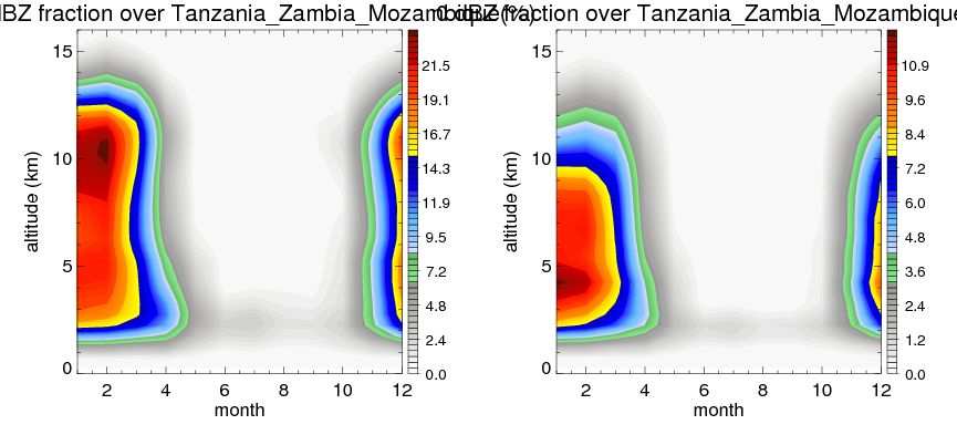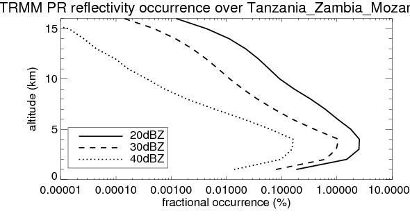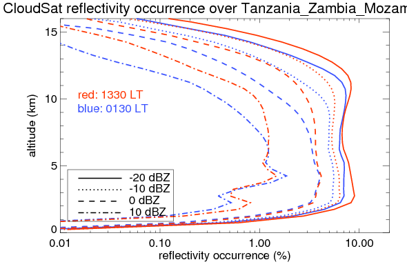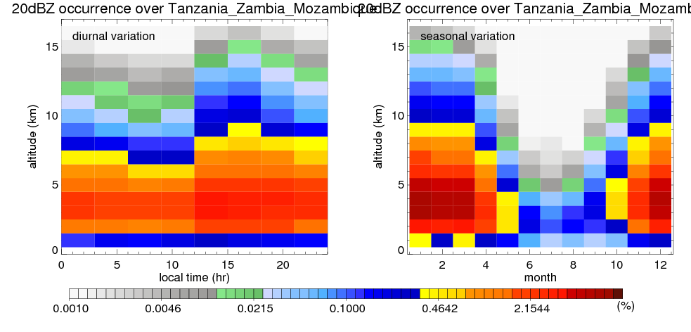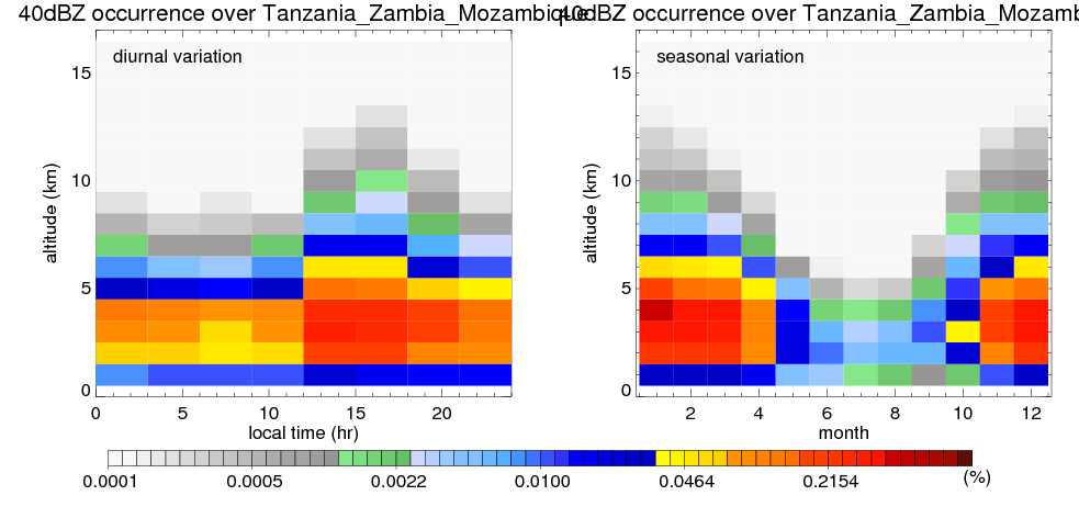 Here the precipitation means the precipitable hydrometeors (raindrops, snow flakes, graupel and hails) that detected by TRMM precipitation radar. Following figure shows the vertical profiles of 20, 30 and 40 dBZ fractional occurrence over Tanzania_Zambia_Mozambique in different seasons. The seasonal and diurnal variations of precipitation (20 dBZ) fractional occurrence at different altitudes are shown below: The seasonal and diurnal variations of INTENSIVE precipitation (40 dBZ) fractional occurrence at different altitudes are shown below: Clouds are consisted of small hydrometeors that undetectable by TRMM precipitation radar (Ku band). CloudSat (W band radar) provides the much great details of clouds. Following figure shows the vertical structure of the thin and thick clouds over Tanzania_Zambia_Mozambique. Note that high reflectivity at low levels are less frequent due to the attenuation. The seasonal variation of thin (-20 dBZ) and thick (0 dBZ) cloud over Tanzania_Zambia_Mozambique are shown below: |