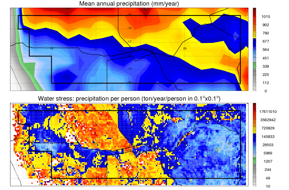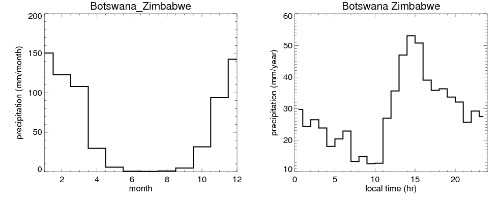 Over Botswana_Zimbabwe , mean annual precipitation are estimated with 691.4 (mm/year) from precipitation radar, and 878.8 (mm/year) from microwave radiometer observations. (see high resolution precipitation product , NOTE: it may take long time to generate for large area) In total, thunderstorms (systems with detected lightning flashes) contribute 60 %, MCSs (Mesoscale convective systems with raining area > 2000 km^2) contribute 66 % of all precipitation. Seasonal and diurnal variations of rainfall over Botswana_Zimbabwe are shown in following figure. You may check the details of rainfall contributions from precipitation systems with different sizes and intensities in various seasons and at different local times. |