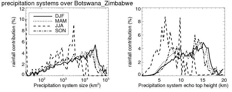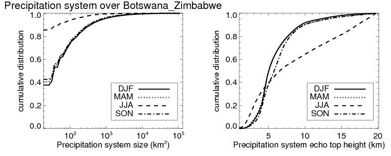 Over Botswana_Zimbabwe , mean size of precipitation system about 325.5 (km^2) and mean maximum radar echo top height of these precipitation systems is about 6.5 km. Following figure shows the cumulative distribution of the sizes and depths of the precipitation systems in different seasons: Though usually there are more small systems, the larger systems would bring more total precipitation. |