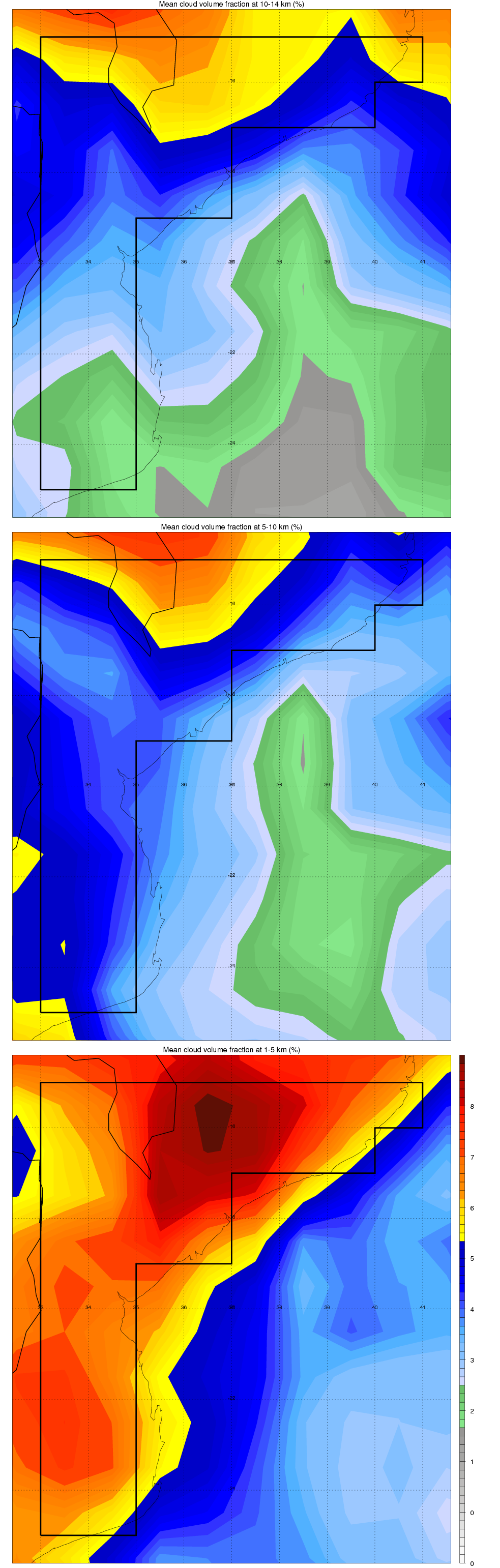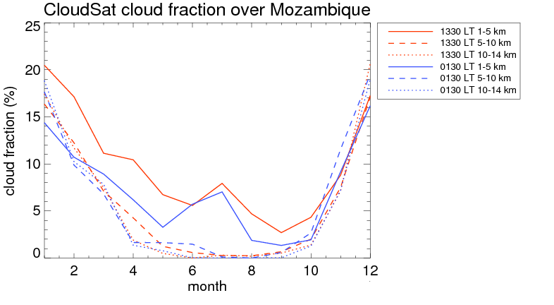 Over Mozambique , mean high level (10-14 km) cloud volume fraction is about 5.3%. Mean mid level (5-10 km) cloud volume fraction is about 5.5%. Mean low level (1-5 km) cloud volume fraction is about 8.4%. Seasonal and day vs. night variations of high, mid and low level cloud fraction over Mozambique are shown in following figure. You may check the details of cloud fraction in various seasons and at different local times. |