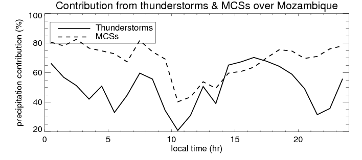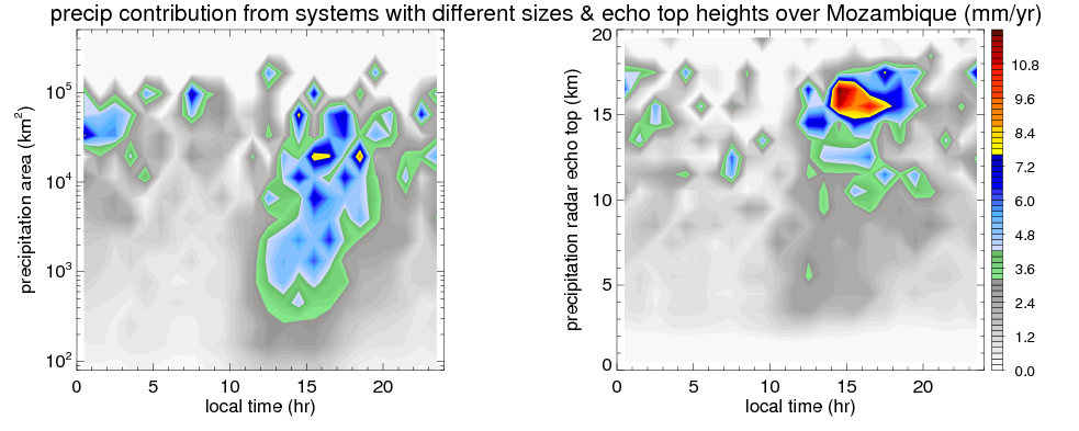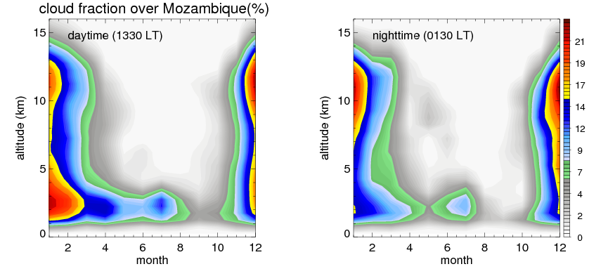 Many studies suggested that the diurnal variation of the precipitation is related to the life cycles of the precipitation systems, which is frequently driven by the surface sensible heating. Over Mozambique, mean annual precipitation are estimated with 813.5 (mm/year) from precipitation radar. Detailed diurnal variation of the precipitation at high resolution can be accessed here (NOTE: it may take long time to generate for a large area). The diurnal variation of precipitation from systems with different sizes and heights are shown below: In total, thunderstorms (systems with detected lightning flashes) contribute 53 %, MCSs (Mesoscale convective systems with raining area > 2000 km^2) contribute 67 % of all precipitation over Mozambique. Diurnal variations of fraction of precipitation from thunderstorms and MCSs over Mozambique are shown below: Certainly there is a strong diurnal variation of different types of clouds. Because CloudSat observes at 0130 and 1330 local time, here the daytime and night cloud fraction in different seasons are presented: |