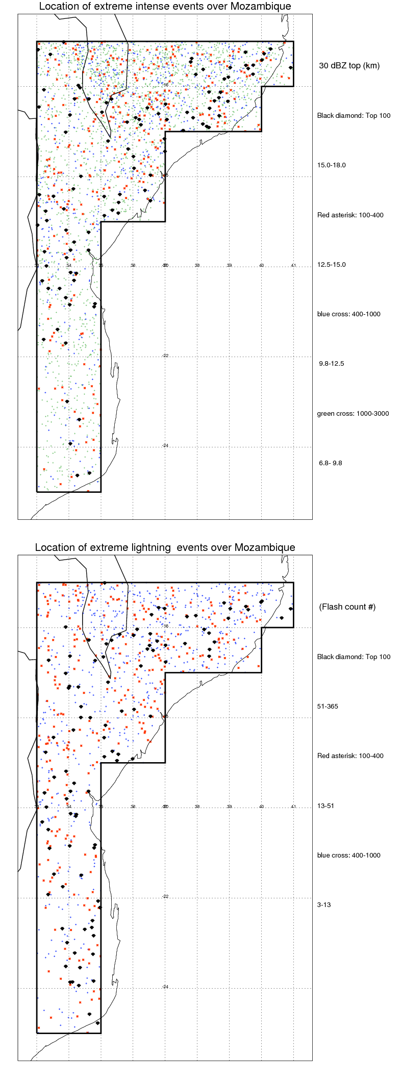 Following figure shows the location of the precipitation feautres categorized by the lightning rate and 30 dBZ echo top.