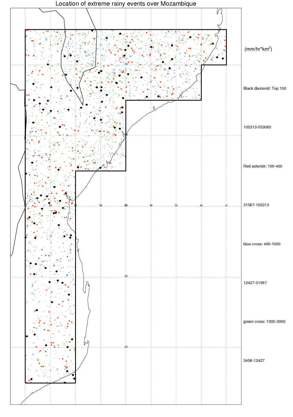 Following figure shows the location of the precipitation feautres categorized by the volumetric rainfall.