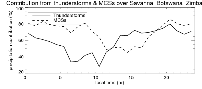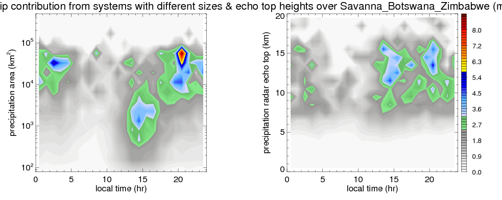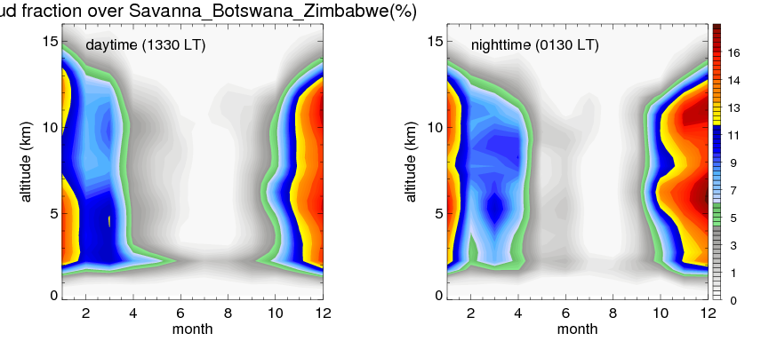 Many studies suggested that the diurnal variation of the precipitation is related to the life cycles of the precipitation systems, which is frequently driven by the surface sensible heating. Over Savanna_Botswana_Zimbabwe, mean annual precipitation are estimated with 512.3 (mm/year) from precipitation radar. Detailed diurnal variation of the precipitation at high resolution can be accessed here (NOTE: it may take long time to generate for a large area). The diurnal variation of precipitation from systems with different sizes and heights are shown below: In total, thunderstorms (systems with detected lightning flashes) contribute 63 %, MCSs (Mesoscale convective systems with raining area > 2000 km^2) contribute 69 % of all precipitation over Savanna_Botswana_Zimbabwe. Diurnal variations of fraction of precipitation from thunderstorms and MCSs over Savanna_Botswana_Zimbabwe are shown below: Certainly there is a strong diurnal variation of different types of clouds. Because CloudSat observes at 0130 and 1330 local time, here the daytime and night cloud fraction in different seasons are presented: |