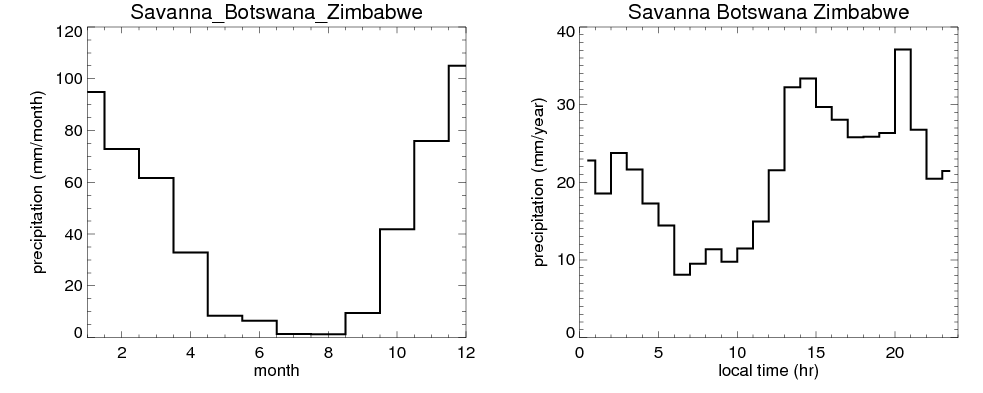 Over Savanna_Botswana_Zimbabwe , mean annual precipitation are estimated with 512.3 (mm/year) from precipitation radar, and 584.1 (mm/year) from microwave radiometer observations. (see high resolution precipitation product , NOTE: it may take long time to generate for large area) In total, thunderstorms (systems with detected lightning flashes) contribute 63 %, MCSs (Mesoscale convective systems with raining area > 2000 km^2) contribute 69 % of all precipitation. Seasonal and diurnal variations of rainfall over Savanna_Botswana_Zimbabwe are shown in following figure. You may check the details of rainfall contributions from precipitation systems with different sizes and intensities in various seasons and at different local times. |