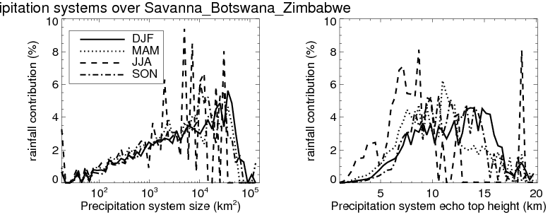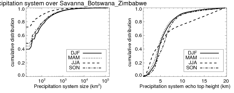 Over Savanna_Botswana_Zimbabwe , mean size of precipitation system about 314.9 (km^2) and mean maximum radar echo top height of these precipitation systems is about 6.4 km. Following figure shows the cumulative distribution of the sizes and depths of the precipitation systems in different seasons: Though usually there are more small systems, the larger systems would bring more total precipitation. |