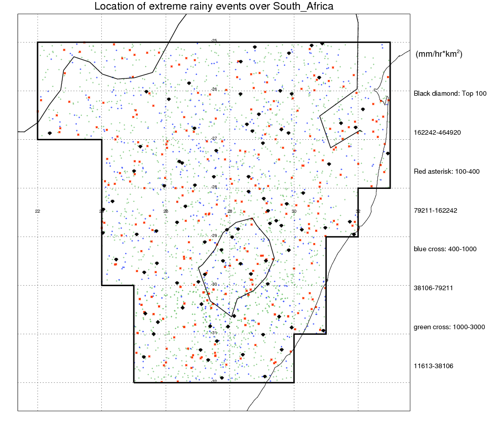 Following figure shows the location of the precipitation feautres categorized by the volumetric rainfall.