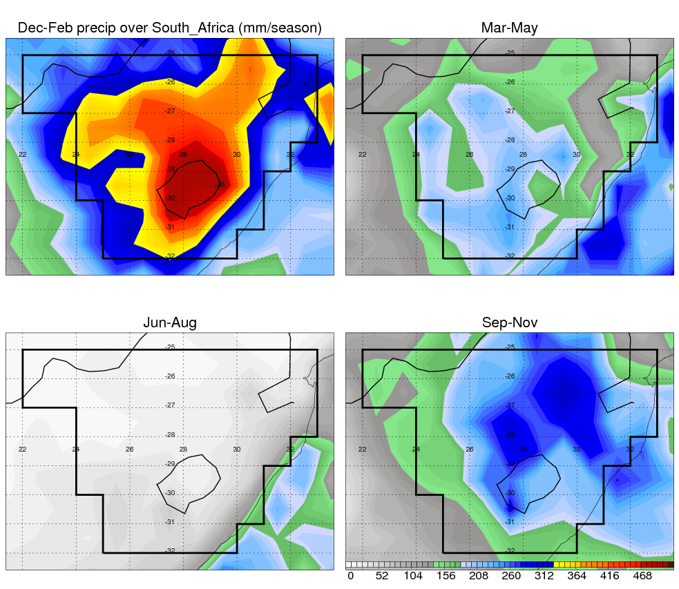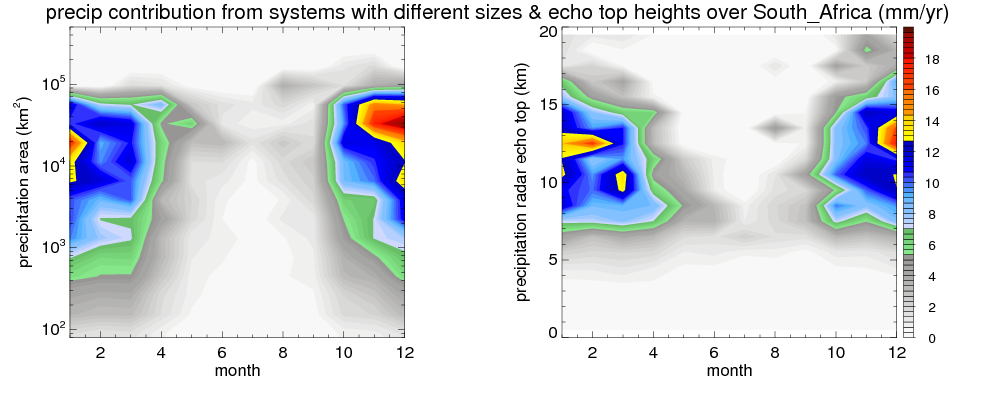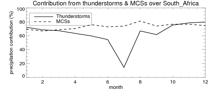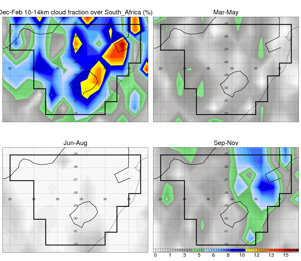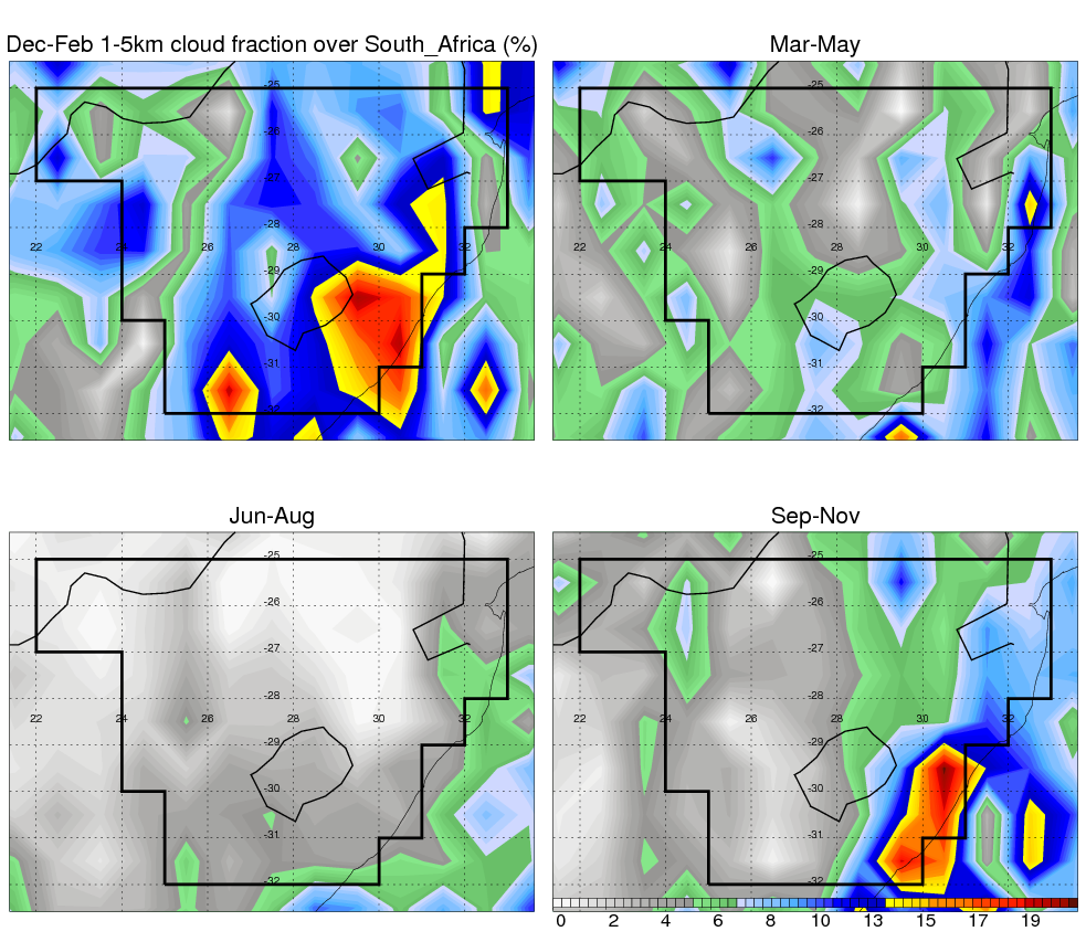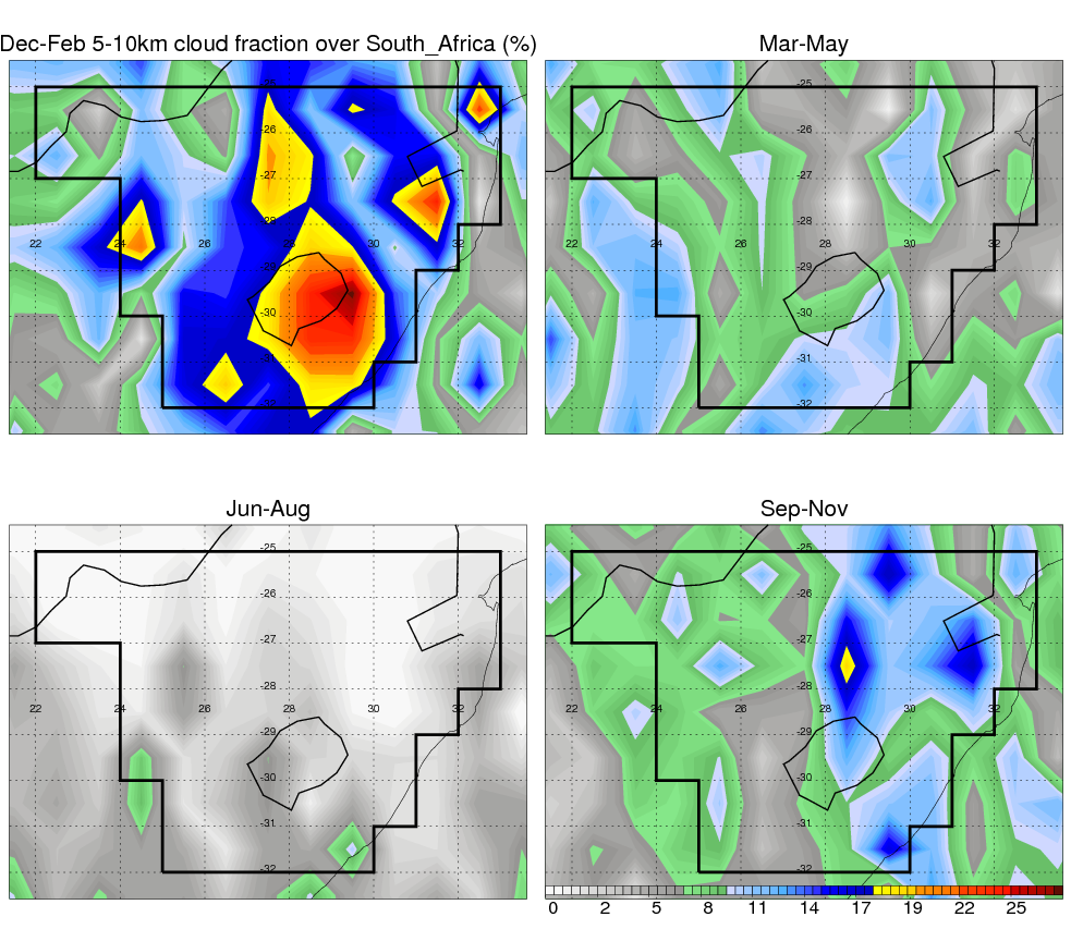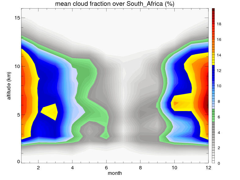 Over South_Africa , mean annual precipitation are estimated with 787.5 (mm/year) from TRMM precipitation radar. (distribution of precipitation see here ) Total surface rainfall is brought by various precipitation systems. The seasonal variation of precipitation from systems with different sizes and heights are shown below: In total, thunderstorms (systems with detected lightning flashes) contribute 71 %, MCSs (Mesoscale convective systems with raining area > 2000 km^2) contribute 72 % of all precipitation. Seasonal variations of fraction of precipitation from thunderstorms and MCSs are shown below: The seasonal variation of geographical distribution of CloudSat cloud fraction over South_Africa is shown below: The seasonal variation of mean CloudSat level cloud fraction at different altitudes over South_Africa is shown below: |