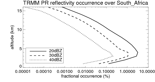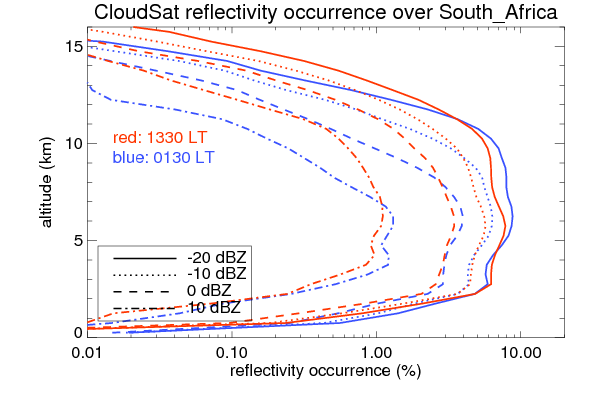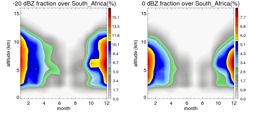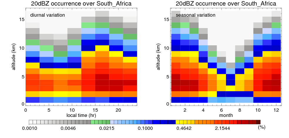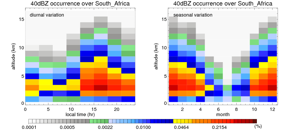 Here the precipitation means the precipitable hydrometeors (raindrops, snow flakes, graupel and hails) that detected by TRMM precipitation radar. Following figure shows the vertical profiles of 20, 30 and 40 dBZ fractional occurrence over South_Africa in different seasons. The seasonal and diurnal variations of precipitation (20 dBZ) fractional occurrence at different altitudes are shown below: The seasonal and diurnal variations of INTENSIVE precipitation (40 dBZ) fractional occurrence at different altitudes are shown below: Clouds are consisted of small hydrometeors that undetectable by TRMM precipitation radar (Ku band). CloudSat (W band radar) provides the much great details of clouds. Following figure shows the vertical structure of the thin and thick clouds over South_Africa. Note that high reflectivity at low levels are less frequent due to the attenuation. The seasonal variation of thin (-20 dBZ) and thick (0 dBZ) cloud over South_Africa are shown below: |