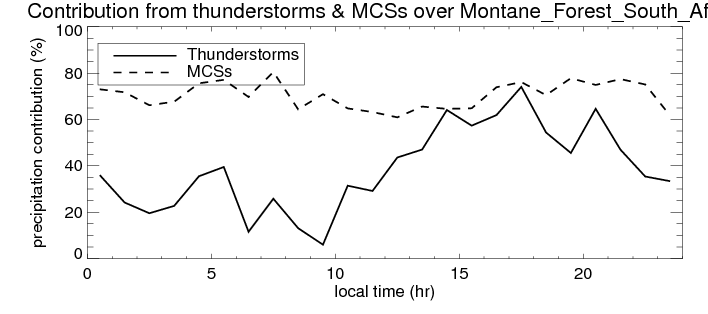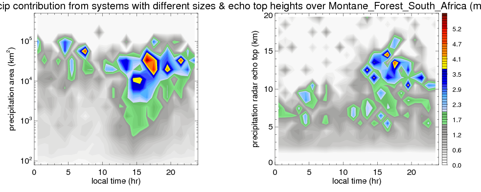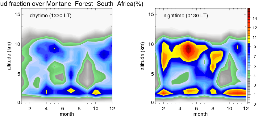 Many studies suggested that the diurnal variation of the precipitation is related to the life cycles of the precipitation systems, which is frequently driven by the surface sensible heating. Over Montane_Forest_South_Africa, mean annual precipitation are estimated with 395.6 (mm/year) from precipitation radar. Detailed diurnal variation of the precipitation at high resolution can be accessed here (NOTE: it may take long time to generate for a large area). The diurnal variation of precipitation from systems with different sizes and heights are shown below: In total, thunderstorms (systems with detected lightning flashes) contribute 44 %, MCSs (Mesoscale convective systems with raining area > 2000 km^2) contribute 70 % of all precipitation over Montane_Forest_South_Africa. Diurnal variations of fraction of precipitation from thunderstorms and MCSs over Montane_Forest_South_Africa are shown below: Certainly there is a strong diurnal variation of different types of clouds. Because CloudSat observes at 0130 and 1330 local time, here the daytime and night cloud fraction in different seasons are presented: |