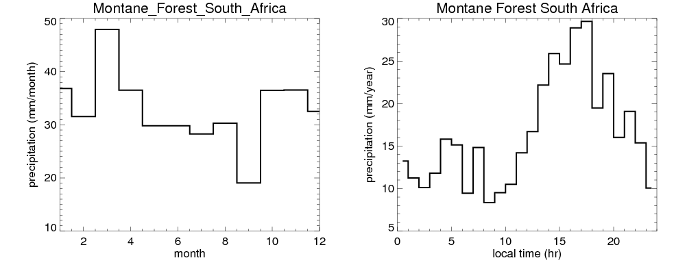 Over Montane_Forest_South_Africa , mean annual precipitation are estimated with 395.6 (mm/year) from precipitation radar, and 305.7 (mm/year) from microwave radiometer observations. (see high resolution precipitation product , NOTE: it may take long time to generate for large area) In total, thunderstorms (systems with detected lightning flashes) contribute 44 %, MCSs (Mesoscale convective systems with raining area > 2000 km^2) contribute 70 % of all precipitation. Seasonal and diurnal variations of rainfall over Montane_Forest_South_Africa are shown in following figure. You may check the details of rainfall contributions from precipitation systems with different sizes and intensities in various seasons and at different local times. |