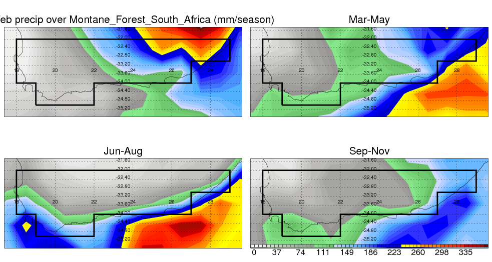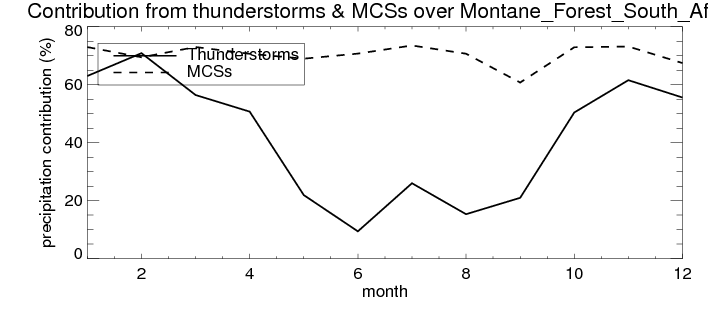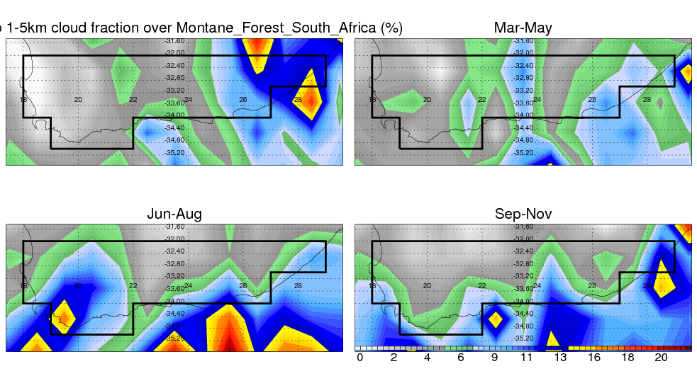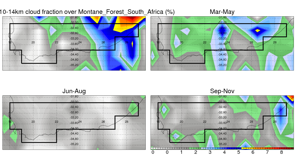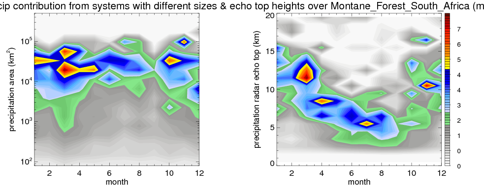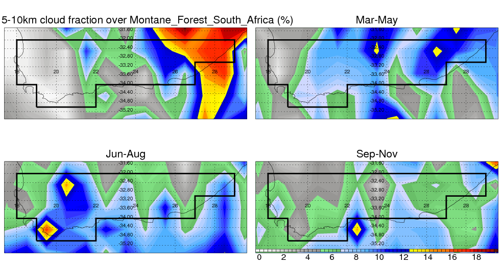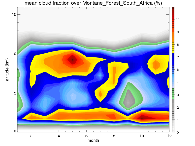Over Montane_Forest_South_Africa , mean annual precipitation are estimated with 395.6 (mm/year) from TRMM precipitation radar. (distribution of precipitation see here ) Total surface rainfall is brought by various precipitation systems. The seasonal variation of precipitation from systems with different sizes and heights are shown below: In total, thunderstorms (systems with detected lightning flashes) contribute 44 %, MCSs (Mesoscale convective systems with raining area > 2000 km^2) contribute 70 % of all precipitation. Seasonal variations of fraction of precipitation from thunderstorms and MCSs are shown below: The seasonal variation of geographical distribution of CloudSat cloud fraction over Montane_Forest_South_Africa is shown below: The seasonal variation of mean CloudSat level cloud fraction at different altitudes over Montane_Forest_South_Africa is shown below: |