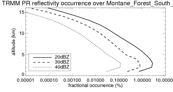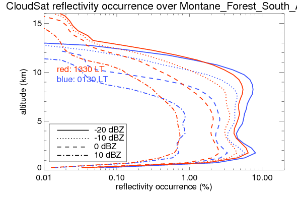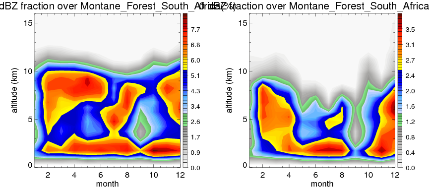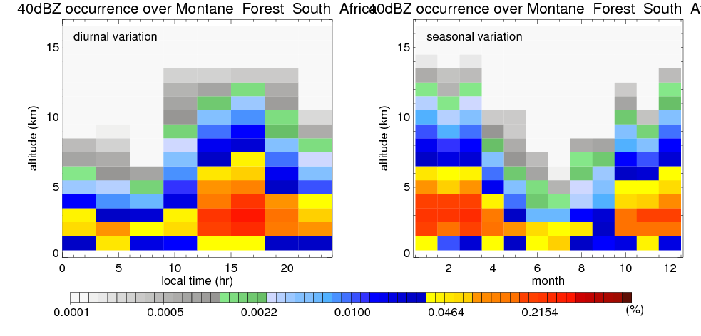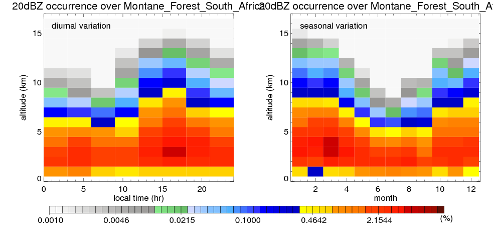 Here the precipitation means the precipitable hydrometeors (raindrops, snow flakes, graupel and hails) that detected by TRMM precipitation radar. Following figure shows the vertical profiles of 20, 30 and 40 dBZ fractional occurrence over Montane_Forest_South_Africa in different seasons. The seasonal and diurnal variations of precipitation (20 dBZ) fractional occurrence at different altitudes are shown below: The seasonal and diurnal variations of INTENSIVE precipitation (40 dBZ) fractional occurrence at different altitudes are shown below: Clouds are consisted of small hydrometeors that undetectable by TRMM precipitation radar (Ku band). CloudSat (W band radar) provides the much great details of clouds. Following figure shows the vertical structure of the thin and thick clouds over Montane_Forest_South_Africa. Note that high reflectivity at low levels are less frequent due to the attenuation. The seasonal variation of thin (-20 dBZ) and thick (0 dBZ) cloud over Montane_Forest_South_Africa are shown below: |