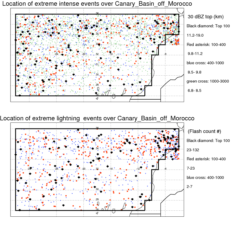 Following figure shows the location of the precipitation feautres categorized by the lightning rate and 30 dBZ echo top.