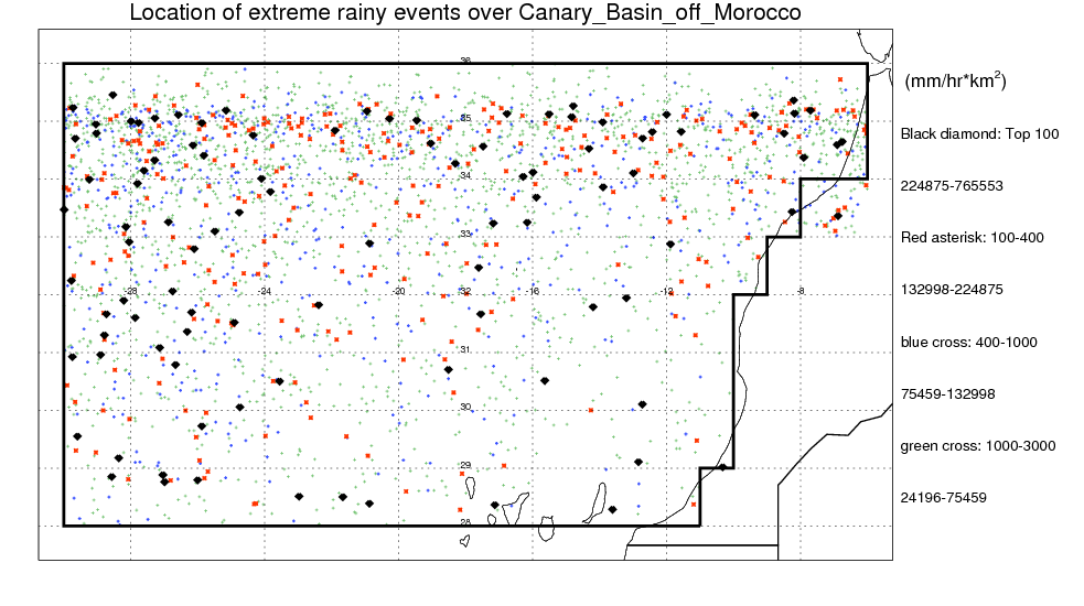 Following figure shows the location of the precipitation feautres categorized by the volumetric rainfall.