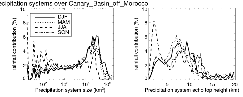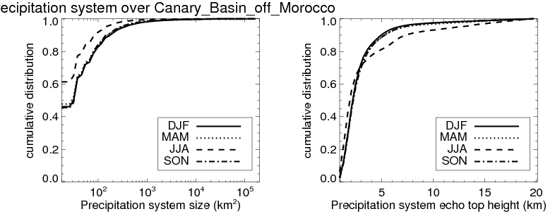 Over Canary_Basin_off_Morocco , mean size of precipitation system about 172.5 (km^2) and mean maximum radar echo top height of these precipitation systems is about 3.3 km. Following figure shows the cumulative distribution of the sizes and depths of the precipitation systems in different seasons: Though usually there are more small systems, the larger systems would bring more total precipitation. |