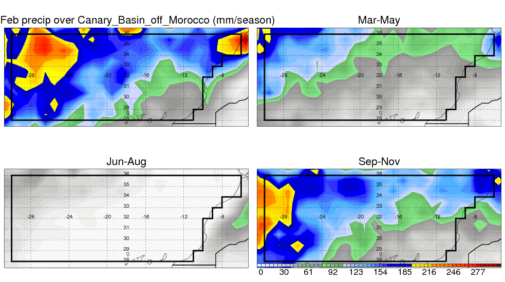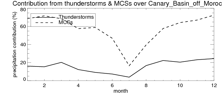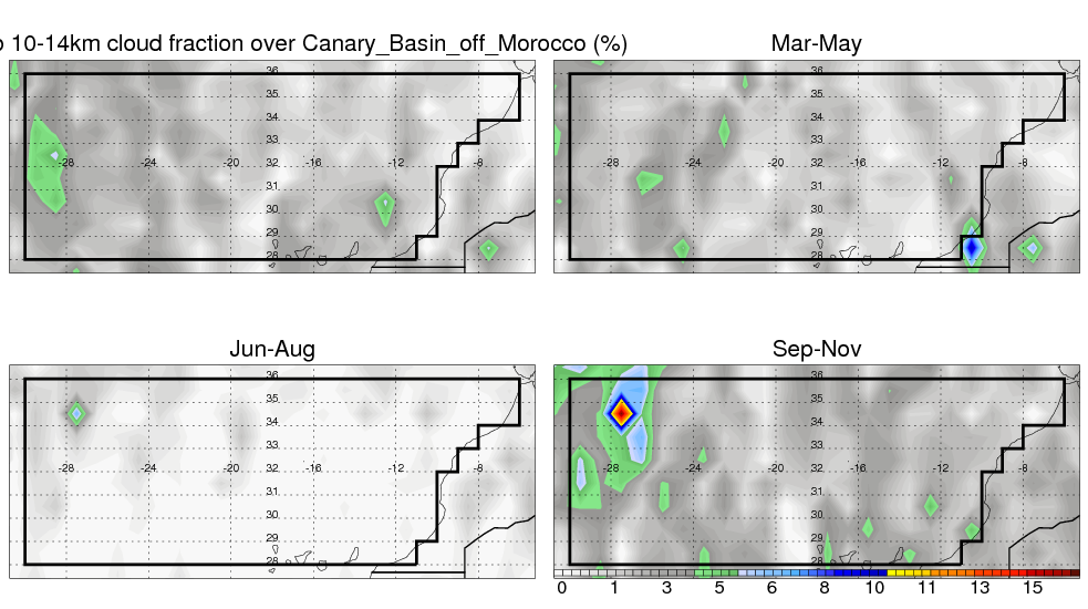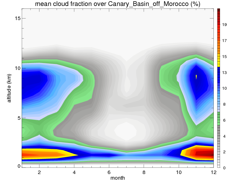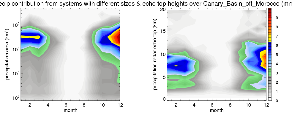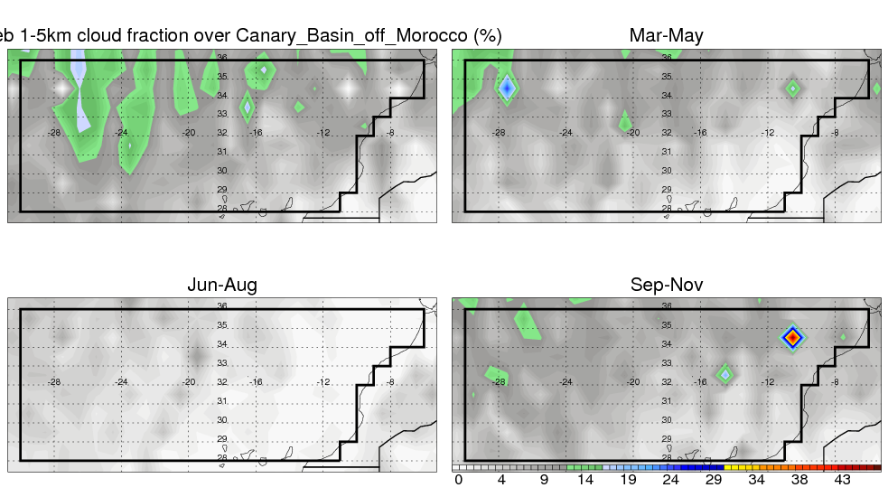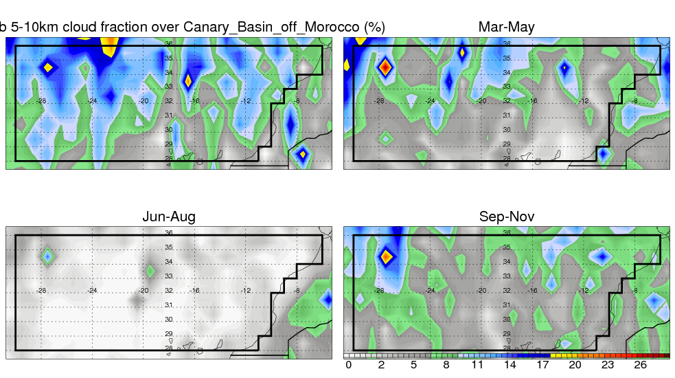 Over Canary_Basin_off_Morocco , mean annual precipitation are estimated with 378.9 (mm/year) from TRMM precipitation radar. (distribution of precipitation see here ) Total surface rainfall is brought by various precipitation systems. The seasonal variation of precipitation from systems with different sizes and heights are shown below: In total, thunderstorms (systems with detected lightning flashes) contribute 19 %, MCSs (Mesoscale convective systems with raining area > 2000 km^2) contribute 66 % of all precipitation. Seasonal variations of fraction of precipitation from thunderstorms and MCSs are shown below: The seasonal variation of geographical distribution of CloudSat cloud fraction over Canary_Basin_off_Morocco is shown below: The seasonal variation of mean CloudSat level cloud fraction at different altitudes over Canary_Basin_off_Morocco is shown below: |