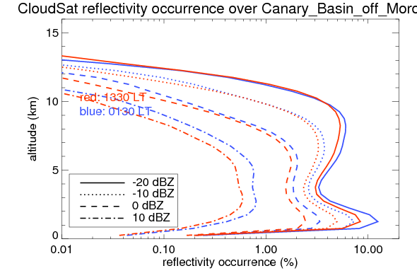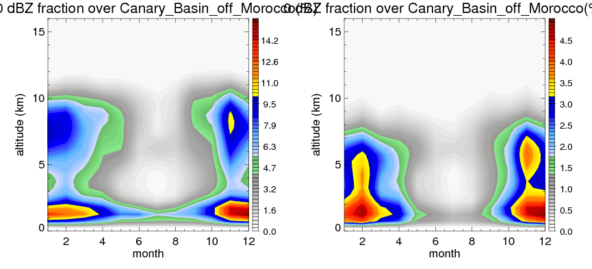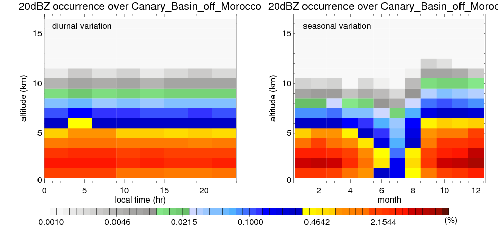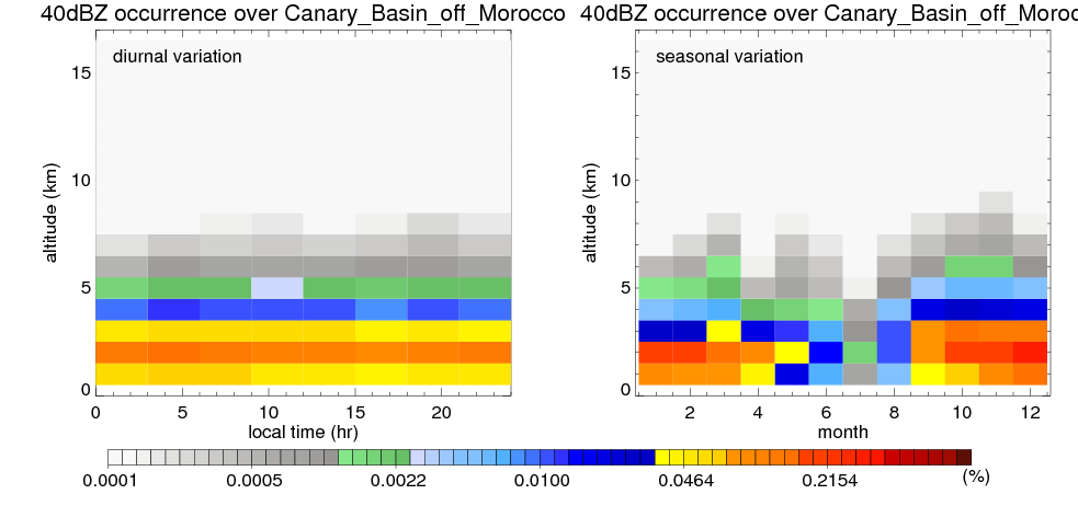 Here the precipitation means the precipitable hydrometeors (raindrops, snow flakes, graupel and hails) that detected by TRMM precipitation radar. Following figure shows the vertical profiles of 20, 30 and 40 dBZ fractional occurrence over Canary_Basin_off_Morocco in different seasons. The seasonal and diurnal variations of precipitation (20 dBZ) fractional occurrence at different altitudes are shown below: The seasonal and diurnal variations of INTENSIVE precipitation (40 dBZ) fractional occurrence at different altitudes are shown below: Clouds are consisted of small hydrometeors that undetectable by TRMM precipitation radar (Ku band). CloudSat (W band radar) provides the much great details of clouds. Following figure shows the vertical structure of the thin and thick clouds over Canary_Basin_off_Morocco. Note that high reflectivity at low levels are less frequent due to the attenuation. The seasonal variation of thin (-20 dBZ) and thick (0 dBZ) cloud over Canary_Basin_off_Morocco are shown below: |