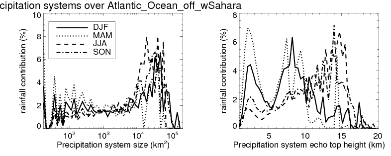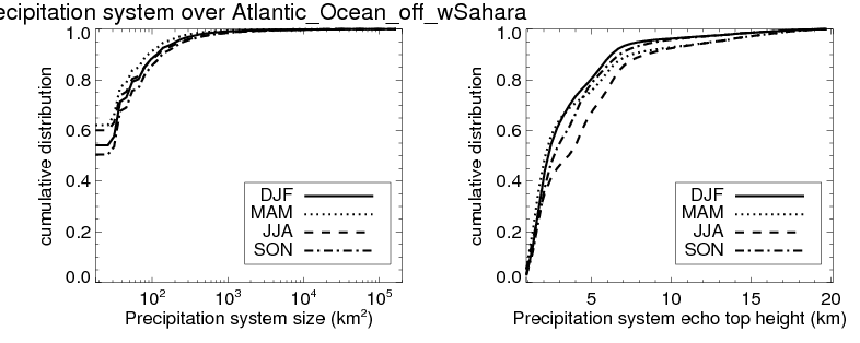 Over Atlantic_Ocean_off_wSahara , mean size of precipitation system about 137.5 (km^2) and mean maximum radar echo top height of these precipitation systems is about 4.0 km. Following figure shows the cumulative distribution of the sizes and depths of the precipitation systems in different seasons: Though usually there are more small systems, the larger systems would bring more total precipitation. |