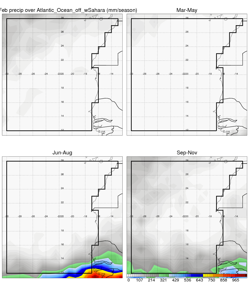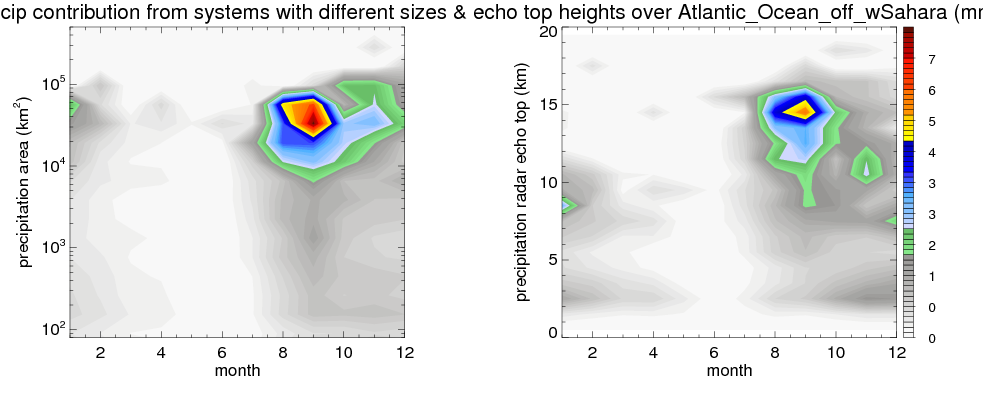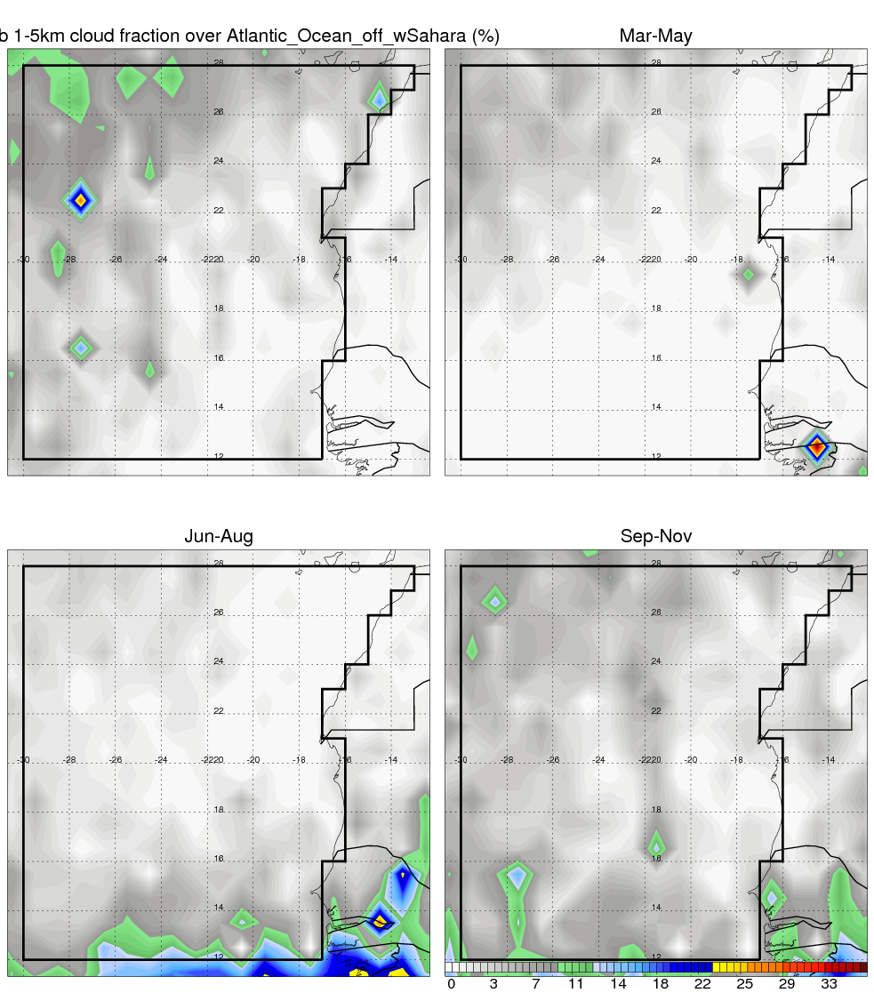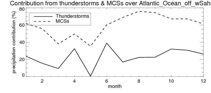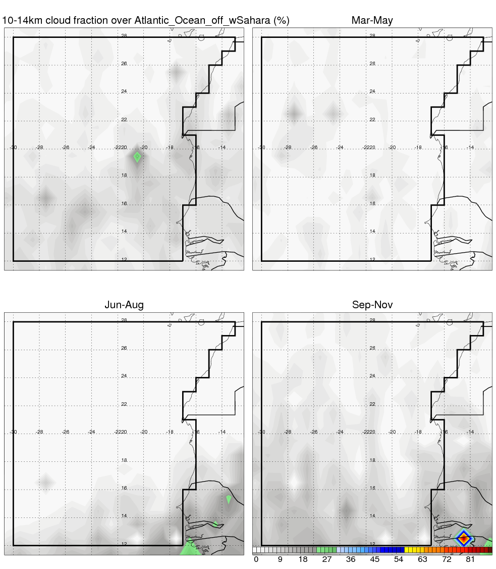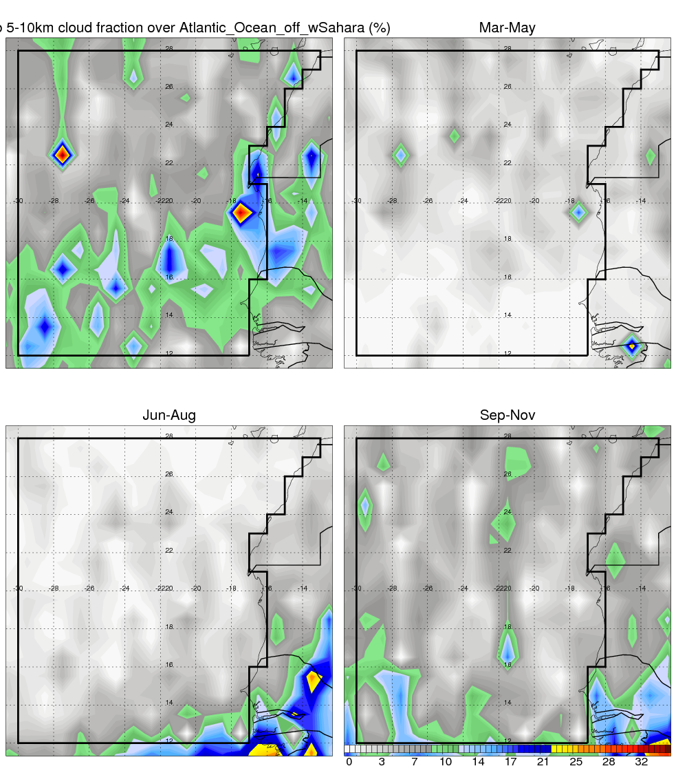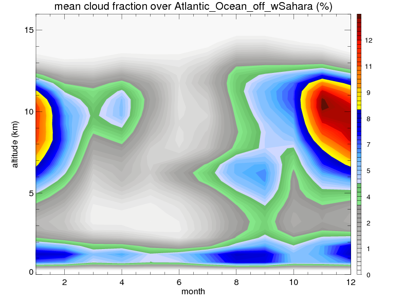 Over Atlantic_Ocean_off_wSahara , mean annual precipitation are estimated with 174.9 (mm/year) from TRMM precipitation radar. (distribution of precipitation see here ) Total surface rainfall is brought by various precipitation systems. The seasonal variation of precipitation from systems with different sizes and heights are shown below: In total, thunderstorms (systems with detected lightning flashes) contribute 24 %, MCSs (Mesoscale convective systems with raining area > 2000 km^2) contribute 66 % of all precipitation. Seasonal variations of fraction of precipitation from thunderstorms and MCSs are shown below: The seasonal variation of geographical distribution of CloudSat cloud fraction over Atlantic_Ocean_off_wSahara is shown below: The seasonal variation of mean CloudSat level cloud fraction at different altitudes over Atlantic_Ocean_off_wSahara is shown below: |