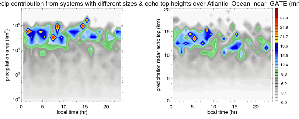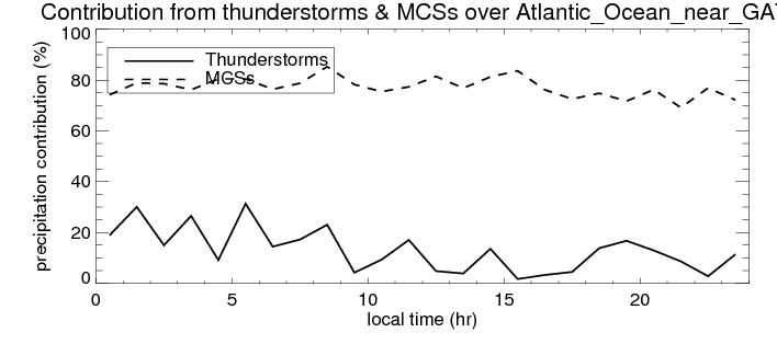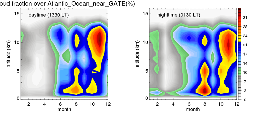 Many studies suggested that the diurnal variation of the precipitation is related to the life cycles of the precipitation systems, which is frequently driven by the surface sensible heating. Over Atlantic_Ocean_near_GATE, mean annual precipitation are estimated with 2047.4 (mm/year) from precipitation radar. Detailed diurnal variation of the precipitation at high resolution can be accessed here (NOTE: it may take long time to generate for a large area). The diurnal variation of precipitation from systems with different sizes and heights are shown below: In total, thunderstorms (systems with detected lightning flashes) contribute 13 %, MCSs (Mesoscale convective systems with raining area > 2000 km^2) contribute 77 % of all precipitation over Atlantic_Ocean_near_GATE. Diurnal variations of fraction of precipitation from thunderstorms and MCSs over Atlantic_Ocean_near_GATE are shown below: Certainly there is a strong diurnal variation of different types of clouds. Because CloudSat observes at 0130 and 1330 local time, here the daytime and night cloud fraction in different seasons are presented: |