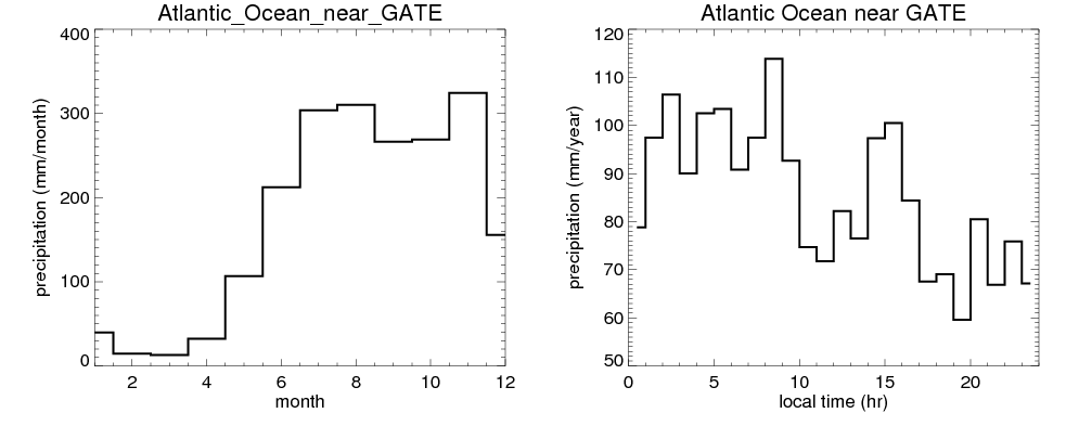 Over Atlantic_Ocean_near_GATE , mean annual precipitation are estimated with 2047.4 (mm/year) from precipitation radar, and 1874.9 (mm/year) from microwave radiometer observations. (see high resolution precipitation product , NOTE: it may take long time to generate for large area) In total, thunderstorms (systems with detected lightning flashes) contribute 13 %, MCSs (Mesoscale convective systems with raining area > 2000 km^2) contribute 77 % of all precipitation. Seasonal and diurnal variations of rainfall over Atlantic_Ocean_near_GATE are shown in following figure. You may check the details of rainfall contributions from precipitation systems with different sizes and intensities in various seasons and at different local times. |